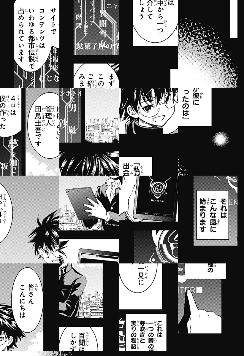 <完結済み>数々の都市伝説の集まる謎のサイト「4u」。貴方はその恐るべき物語を垣間見る……!少年ジャンプを始め各誌で話題となった現代ホラーが連載開始![JC2巻発売中]