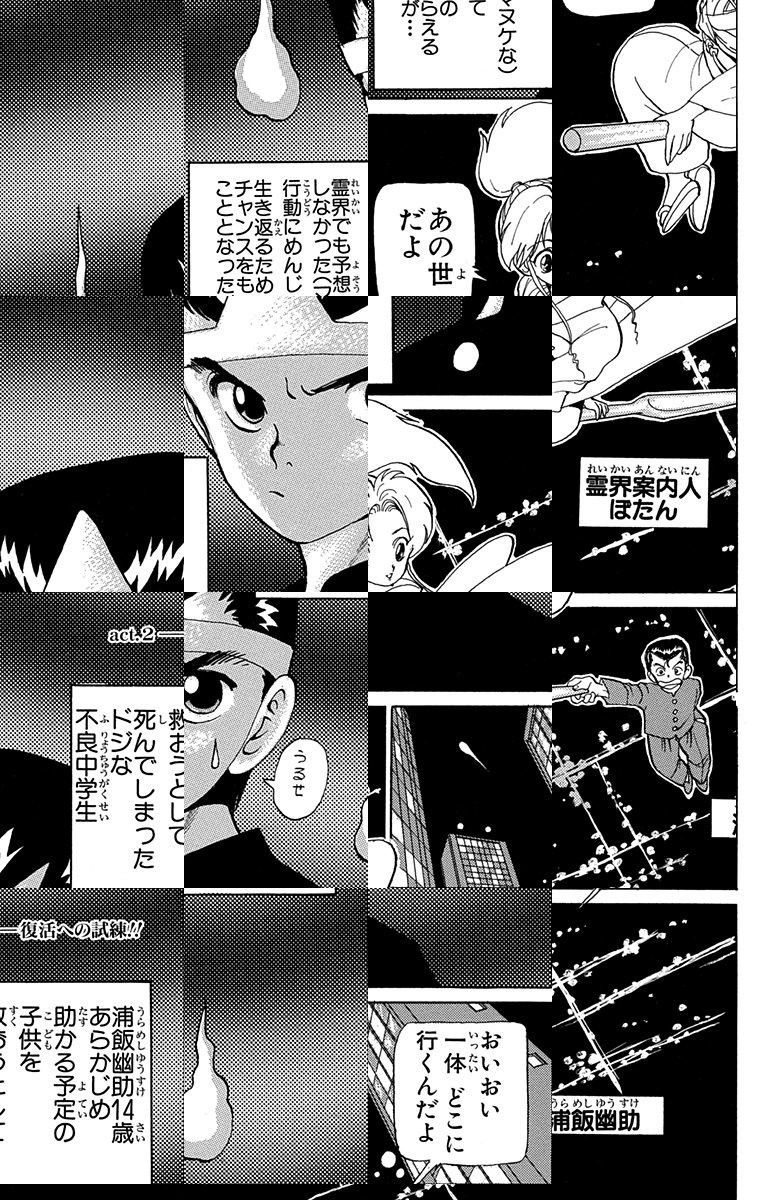 <完結済み>教師も手をやく不良の浦飯幽助。ある日子供を助けて事故にあい、幽霊になってしまう。予定外の死に閻魔大王は、生き返るための試練として、人の心を映す霊界獣の卵をかえすことを命じるが…!