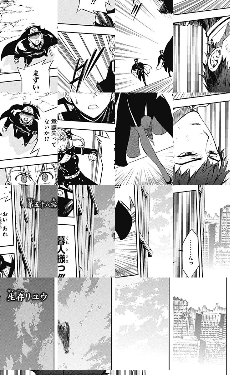 未知のウイルスにより人類は壊滅、子供だけが生き残り、地下都市で吸血鬼に支配されていた。百夜優一郎は仲間たちの犠牲のもと、ただ一人脱出に成功、復讐を誓う。