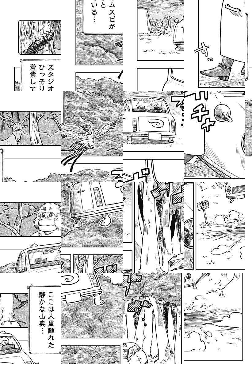 絵本をいくつも積み重ね、一冊の本にしたような世界。山奥でひっそりと営むスタジオムスビ。五代目店主のゴエンは今日も、人と人とを繋ぐ唯一無二の作品を造るのだ。