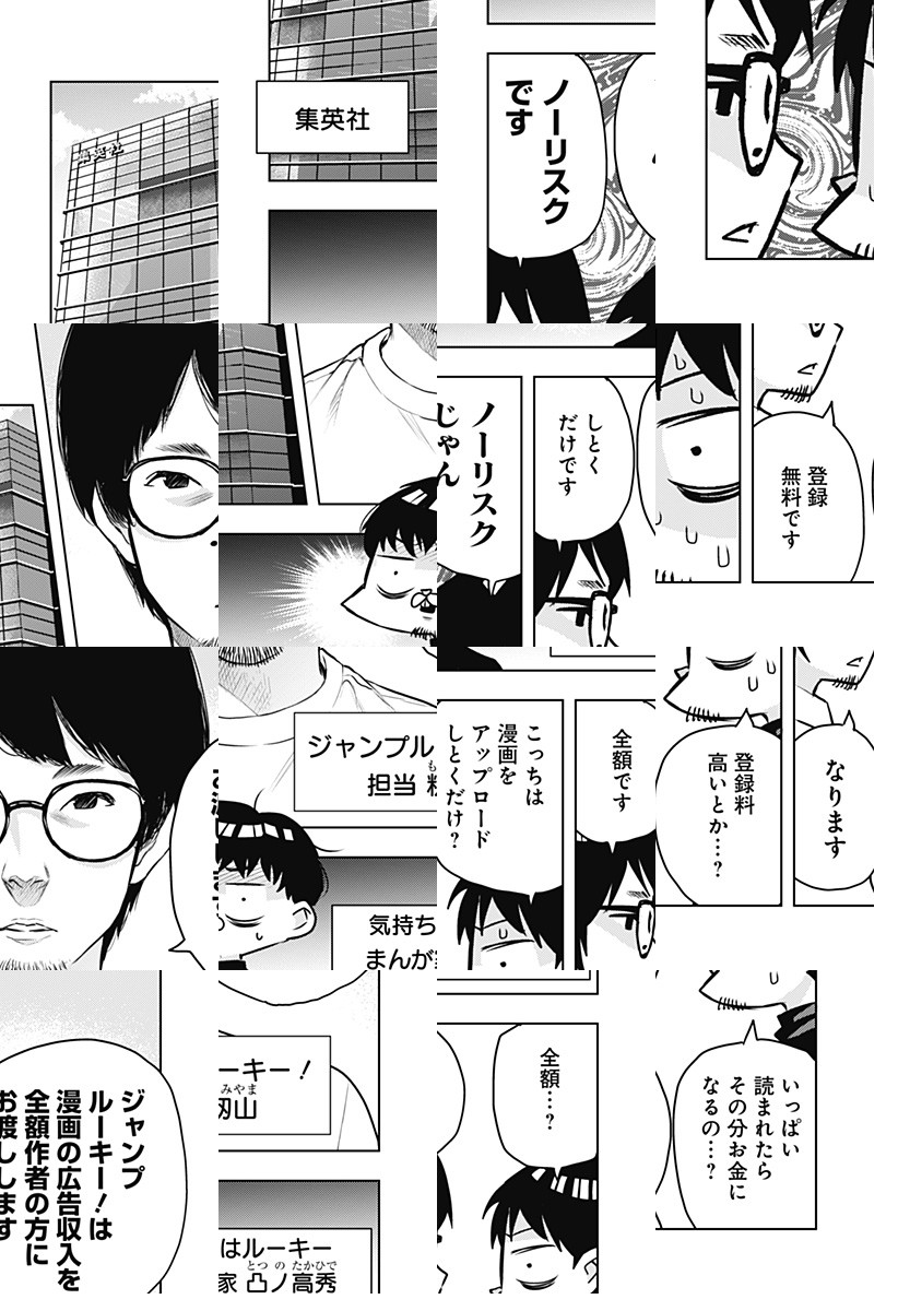 ジャンプルーキー!に投稿した作品の広告収入は全額、作者に入ります。美味しい話すぎて、嘘かと思うかもしれないですが、本当です。漫画で読んで頂いて「本当」だということを、信じて頂ければ幸いです。
