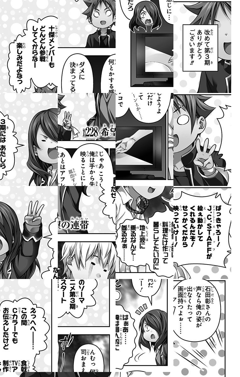 <完結済み>下町の定食屋を営む中学生・幸平創真。目標である料理人の父を越える為、創真は修業の毎日を送っていた。しかし突然、料理学校への編入話を告げられ…!? 創造する新料理マンガ、ここに開演!!