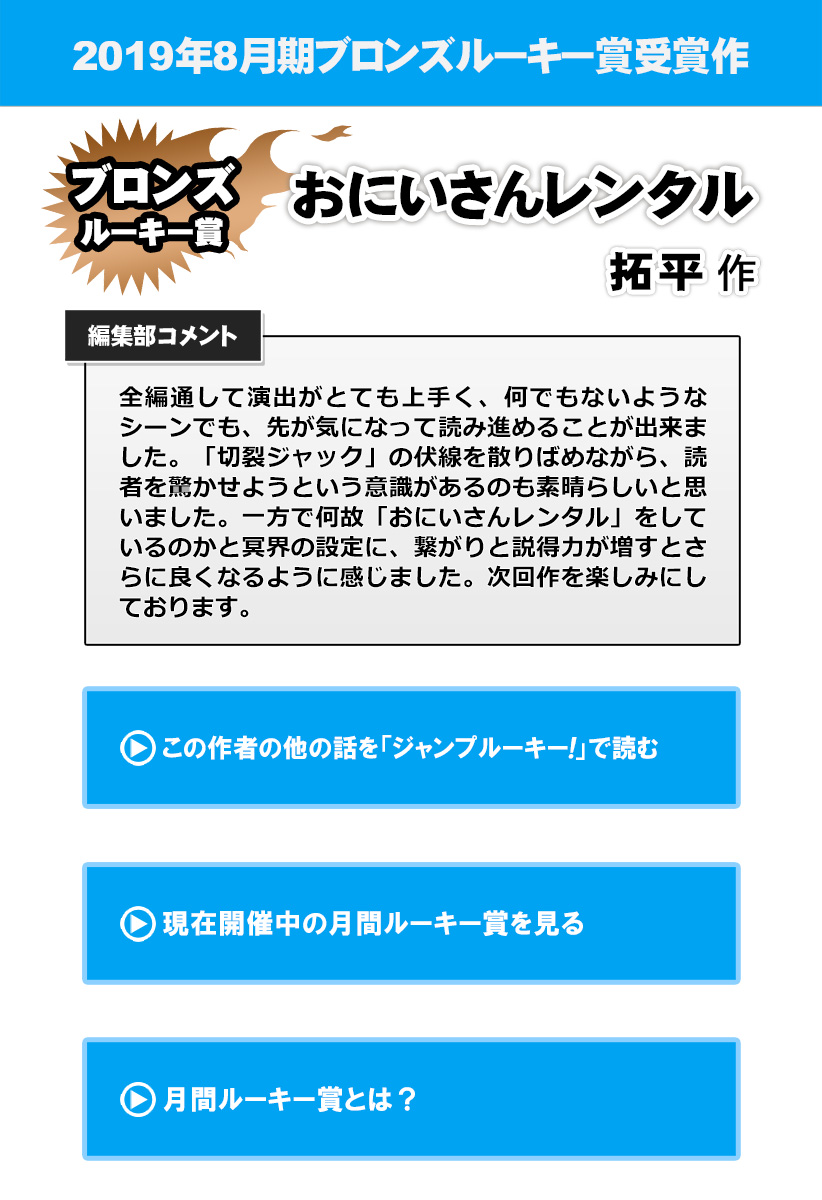 2019年8月期ブロンズルーキー受賞作!連続殺人事件が世間を騒がす中、佳乃子は彼氏のフリをしてもらうために「おにいさんレンタル」を利用して・・・!?