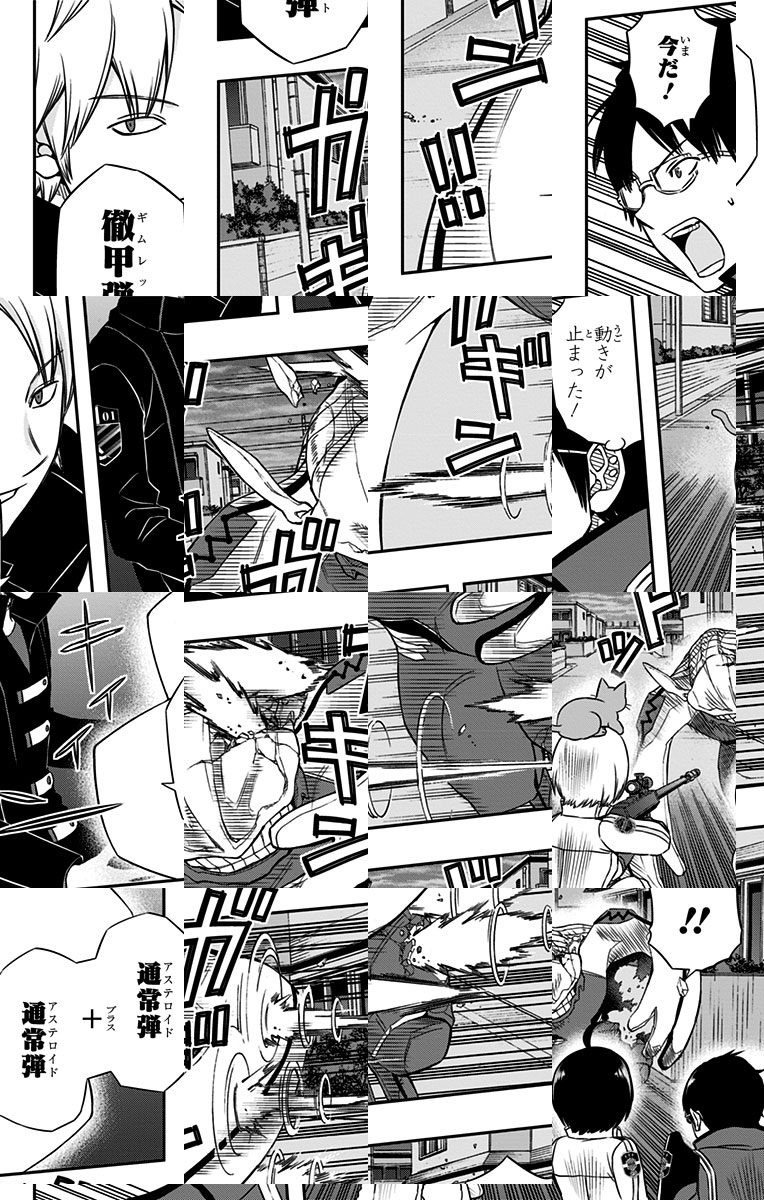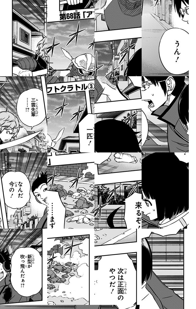 異次元からの侵略者「近界民」の脅威にさらされている三門市。そこに住む少し正義感の強い中学生・三雲修は、謎の転校生・空閑遊真と出会う。遊真の行動に振り回される修の運命は!? 最新型SFアクション始動!!