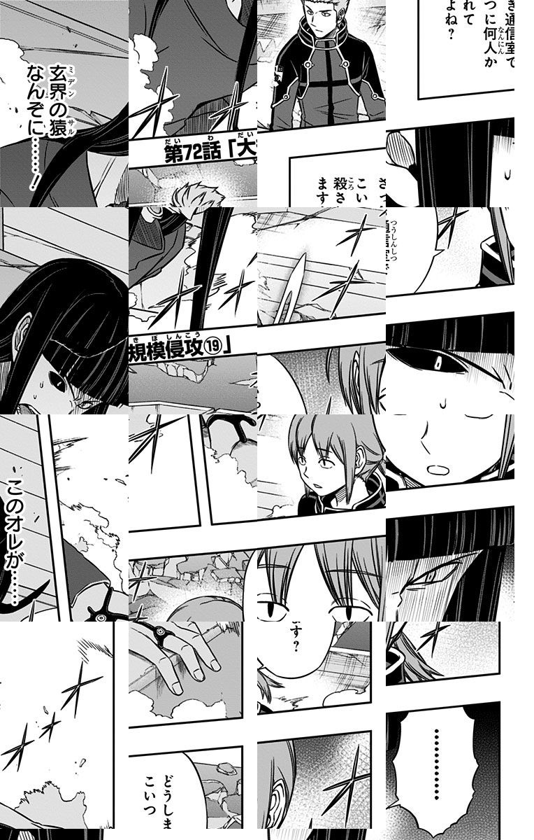 異次元からの侵略者「近界民」の脅威にさらされている三門市。そこに住む少し正義感の強い中学生・三雲修は、謎の転校生・空閑遊真と出会う。遊真の行動に振り回される修の運命は!? 最新型SFアクション始動!!