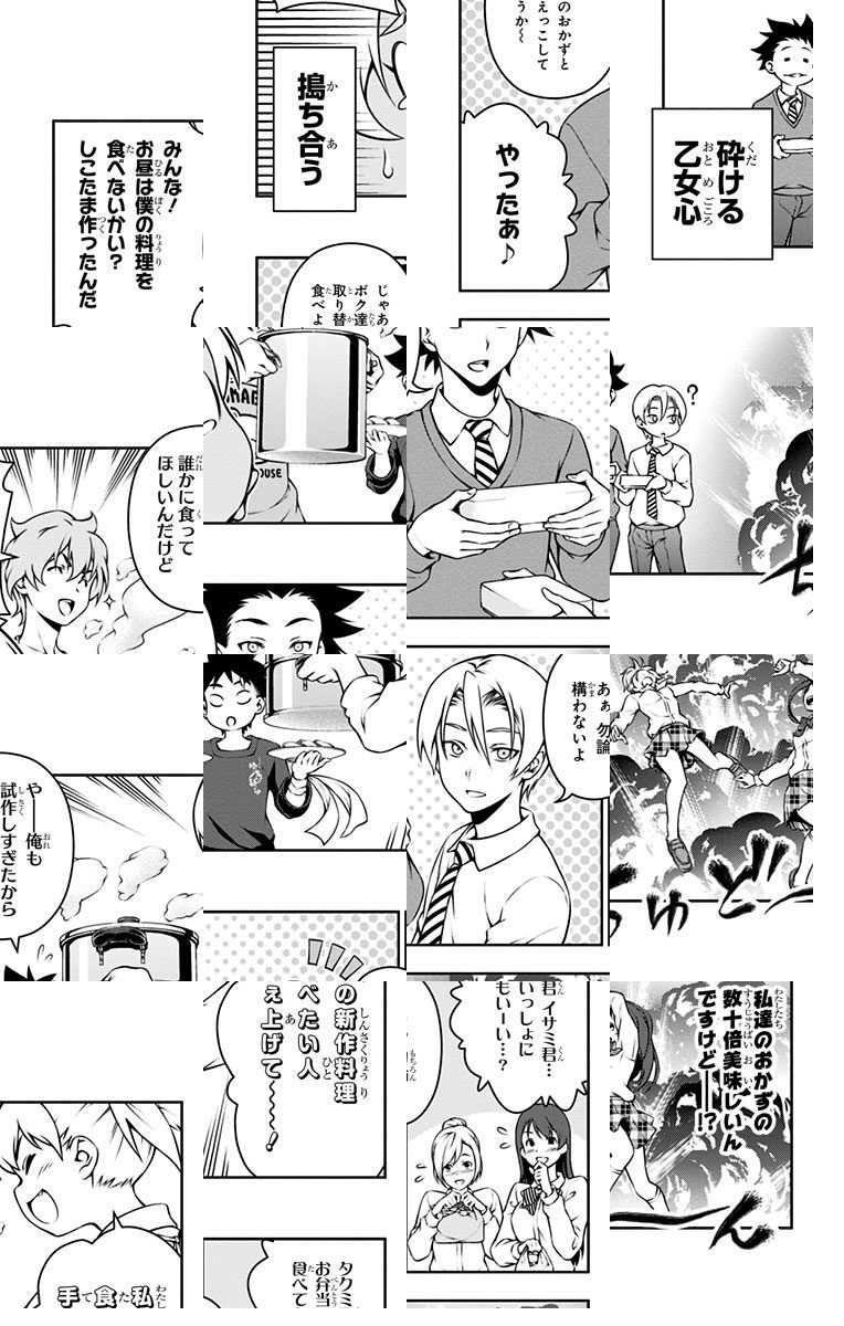 <完結済み>下町の定食屋を営む中学生・幸平創真。目標である料理人の父を越える為、創真は修業の毎日を送っていた。しかし突然、料理学校への編入話を告げられ…!? 創造する新料理マンガ、ここに開演!!