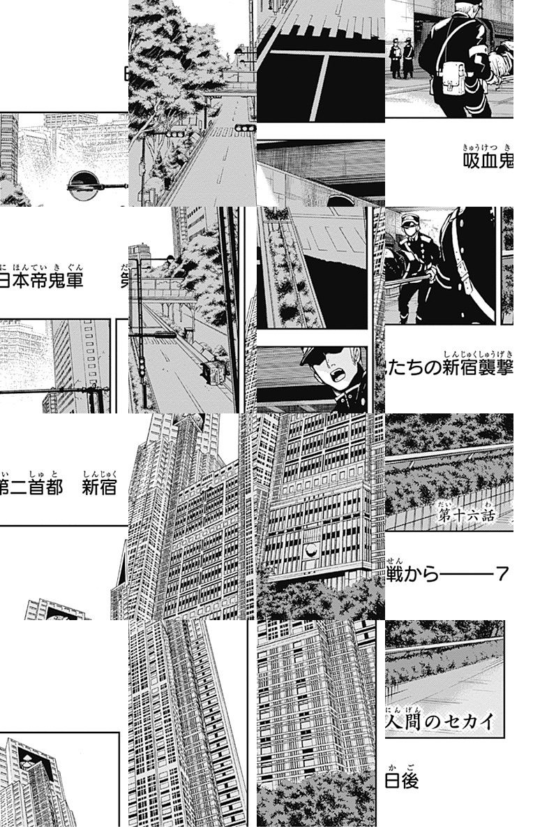 未知のウイルスにより人類は壊滅、子供だけが生き残り、地下都市で吸血鬼に支配されていた。百夜優一郎は仲間たちの犠牲のもと、ただ一人脱出に成功、復讐を誓う。