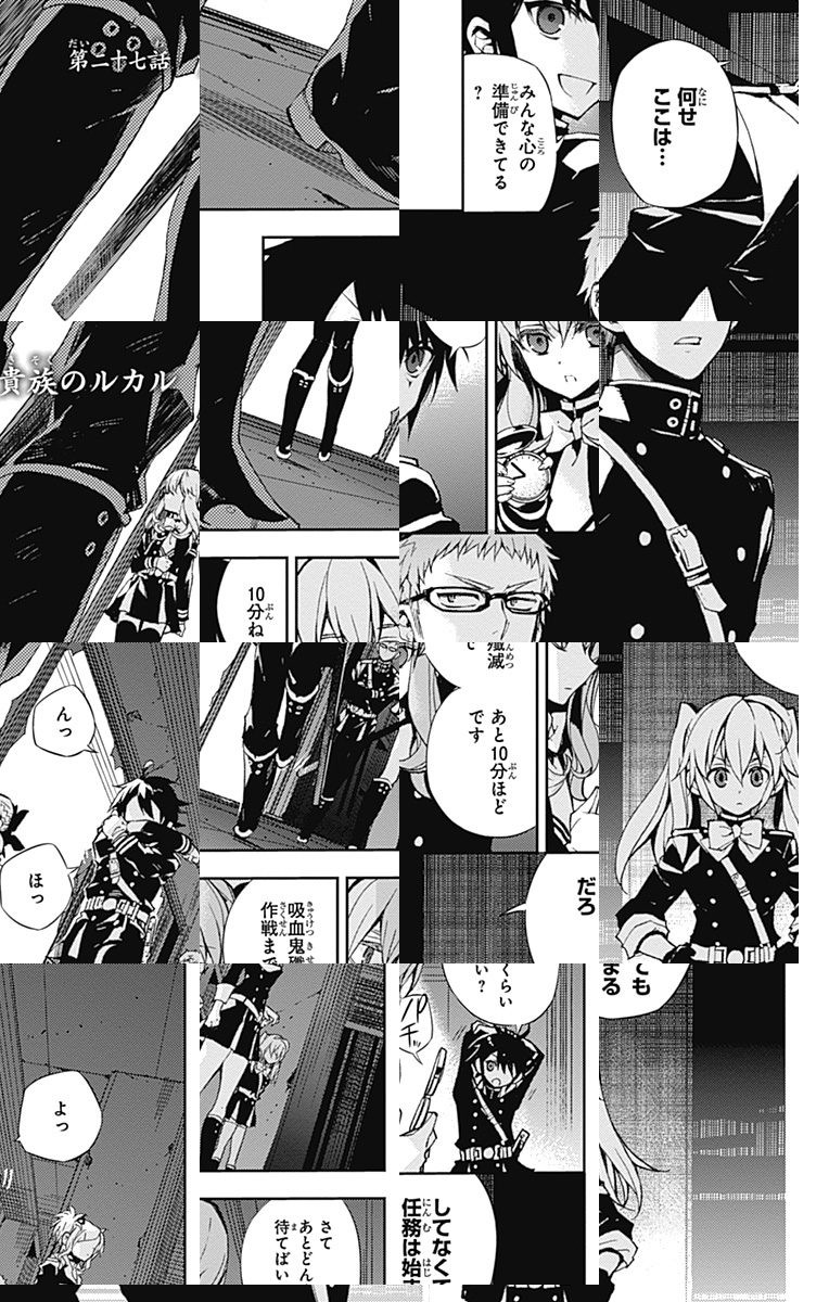 未知のウイルスにより人類は壊滅、子供だけが生き残り、地下都市で吸血鬼に支配されていた。百夜優一郎は仲間たちの犠牲のもと、ただ一人脱出に成功、復讐を誓う。