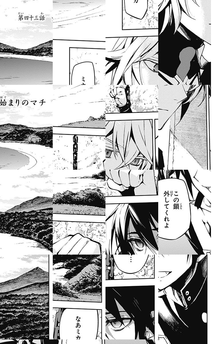 未知のウイルスにより人類は壊滅、子供だけが生き残り、地下都市で吸血鬼に支配されていた。百夜優一郎は仲間たちの犠牲のもと、ただ一人脱出に成功、復讐を誓う。