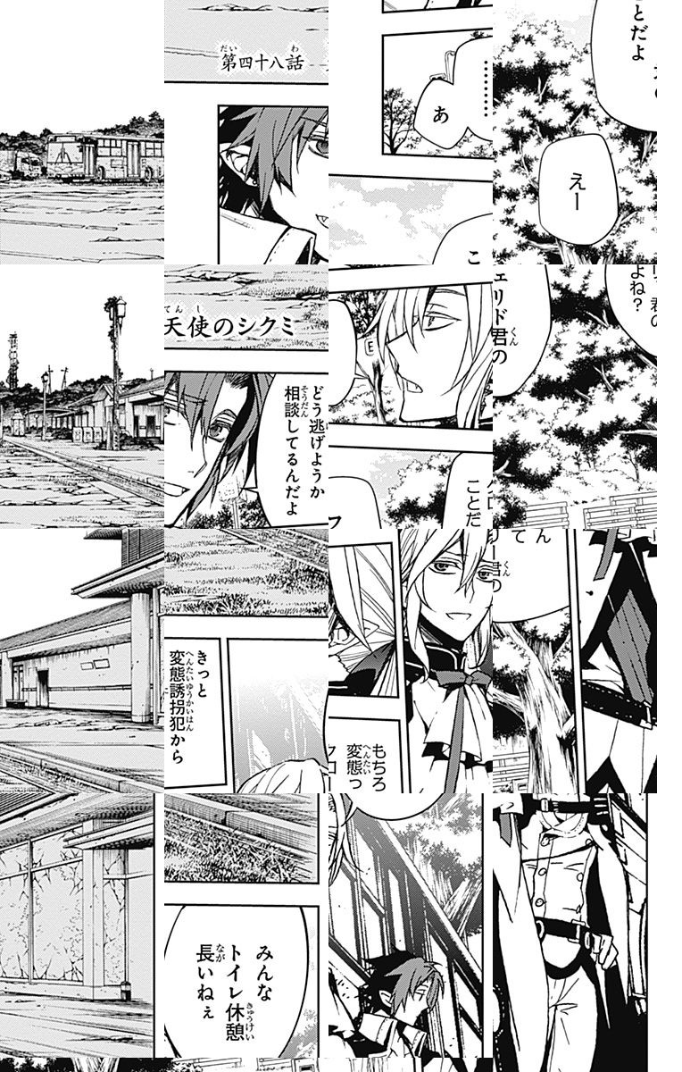 未知のウイルスにより人類は壊滅、子供だけが生き残り、地下都市で吸血鬼に支配されていた。百夜優一郎は仲間たちの犠牲のもと、ただ一人脱出に成功、復讐を誓う。