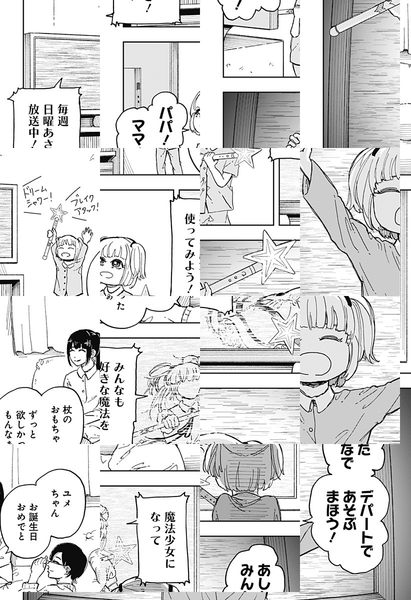 魔法少女に憧れる幼児・ユメちゃんは、自身も魔法を使えると心から信じていた。憂鬱な職場に心を病み命を絶とうとしていた大人に出会うのだが……!?