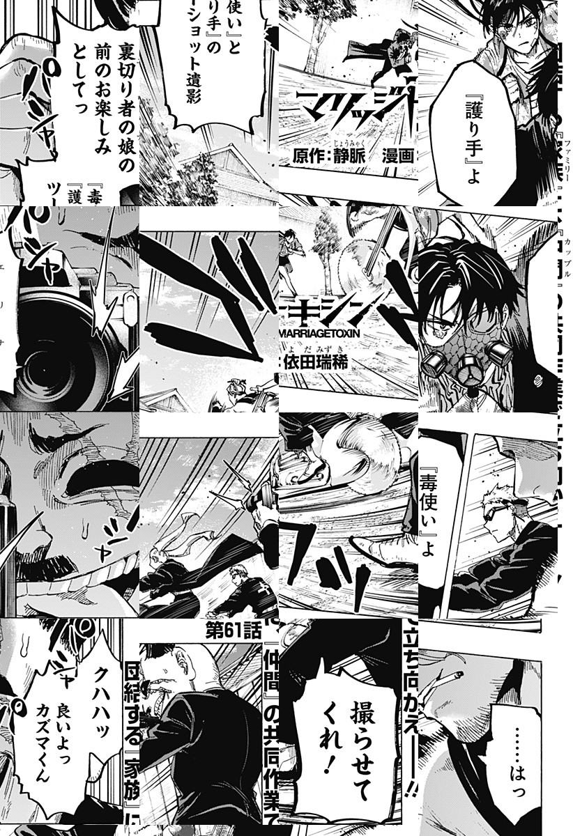 <毎週水曜更新!最新5話無料>TVアニメ化決定! 数百年続く殺し屋『毒使い』の青年・下呂。裏稼業に身を置き、女性が苦手な彼にとって結婚はするべきではないものだった。しかし、『毒使い』の血を絶えさせないため実家は彼の妹に対し、強制的に跡継ぎを産ませることを通告。そんな時、下呂は仕事のターゲットだった結婚詐欺師・城崎と出会い…!?「――そんな提案(プロポーズ)、初めて」結婚詐欺師をアドバイザーにした殺し屋の婚活が始まる!目指すは最高の結婚…世界一ハードな婚活バトルアクション!! [JC16巻発売中]