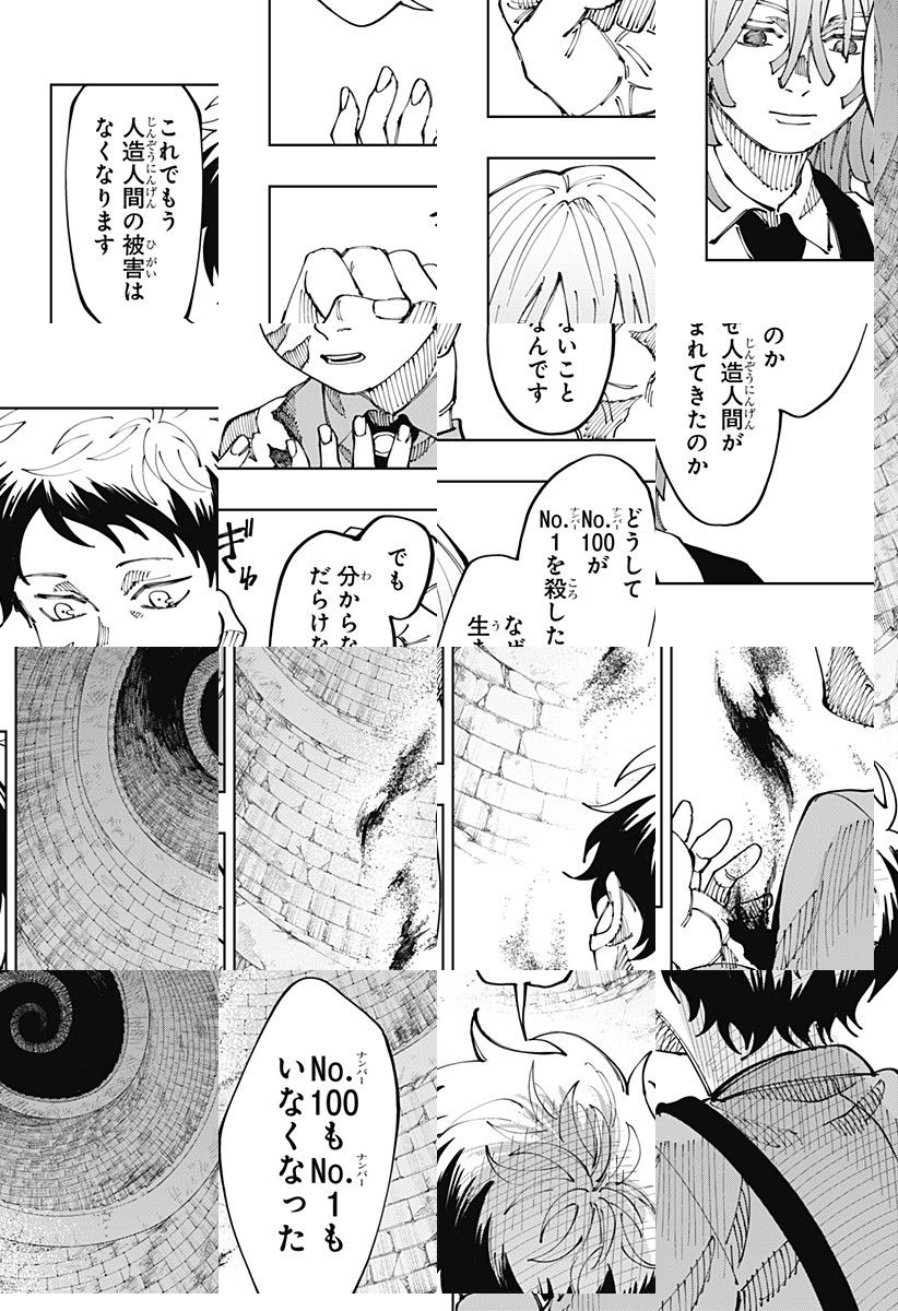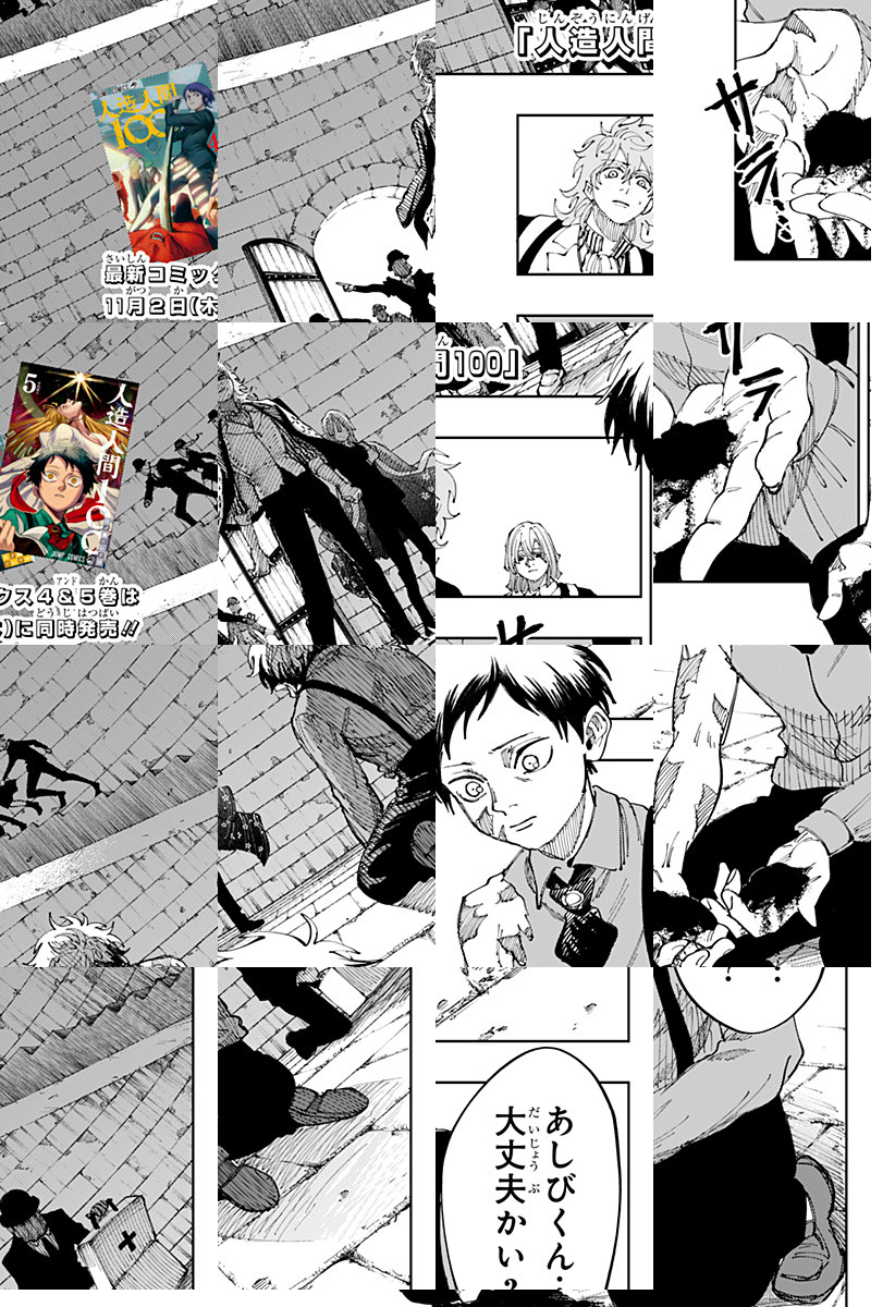 週刊少年ジャンプにて完結した「人造人間100」。主人公・あしびの手元には人造人間を生み出した博士の手記が。本編内で明かされなかった謎が解明される特別番外編読切39ページ!!