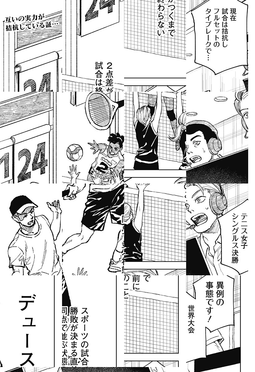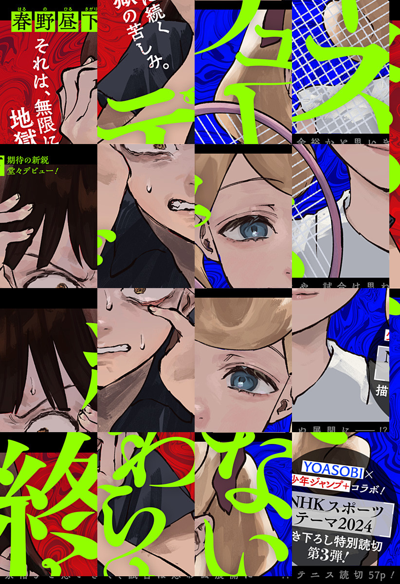 テニスの絶対王者のイチは、新星のメルルとの試合に臨む。すぐに勝てると思ったイチだが、試合は予想外の展開に…!?YOASOBI×少年ジャンプ+コラボ!「NHKスポーツテーマ2024」描き下ろし特別読切第3弾!
