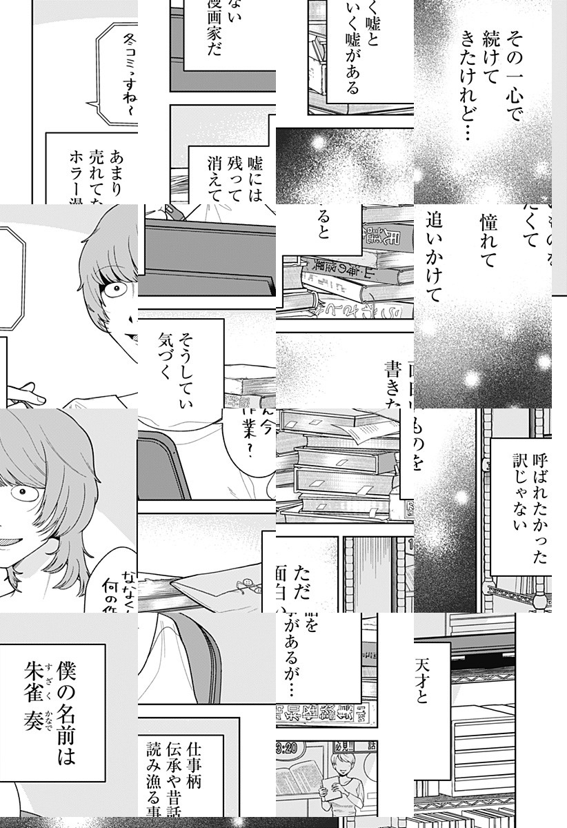 <隔週日曜更新!最新2話無料>怖い話には、その語り手の「ほんとうの心」が隠されている。怪談を語る者とそれを聞く者の間に見えてくる、語り手の「こころの中の真実」とは――?恐ろしいのに優しくて、怖いのに温かい。新感覚ホラー×セラピー! [JC3巻4/3発売予定]