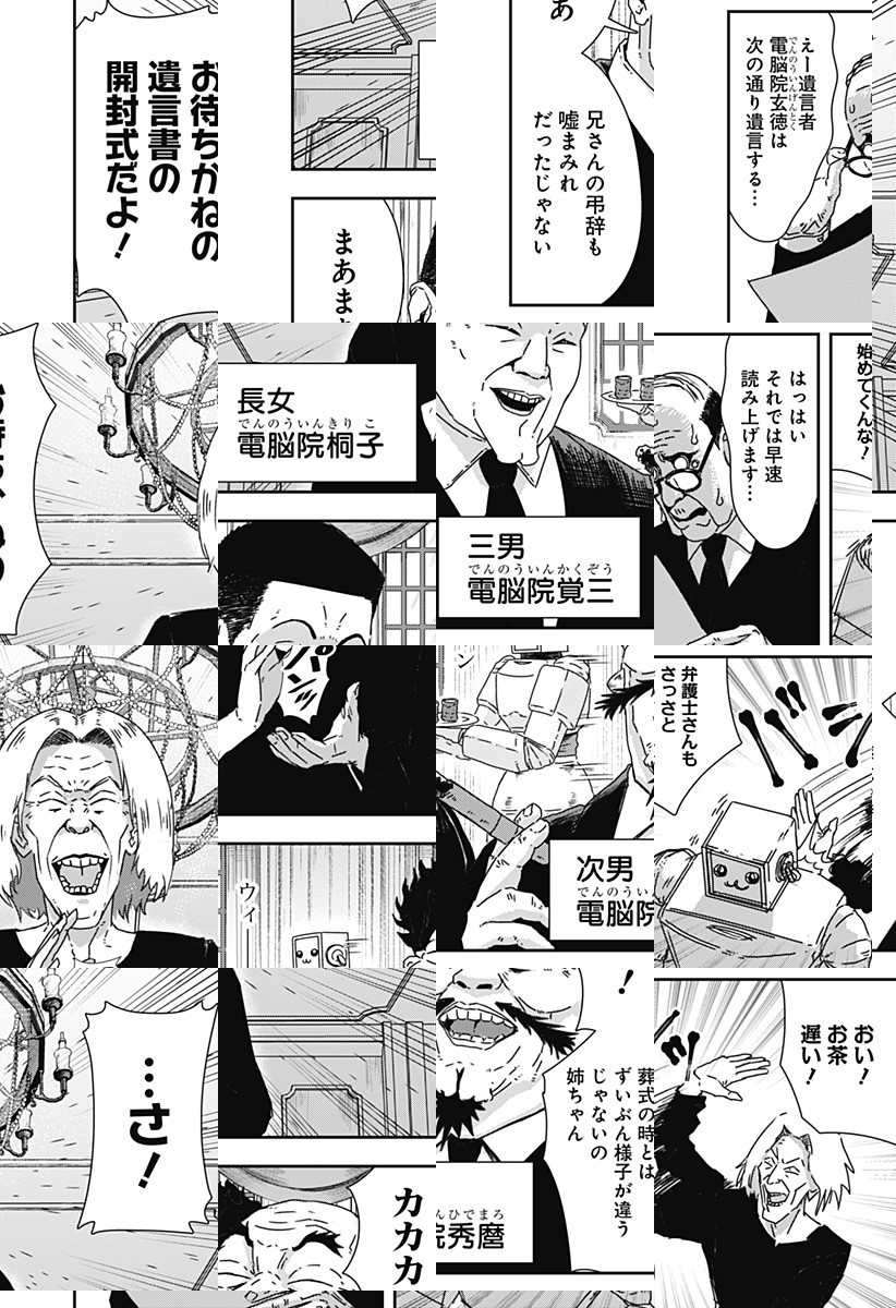 AI財閥・電脳院家の当主、玄徳が亡くなった。三人の子どもたちは息をのんで、父が残した莫大な財産の行方を見守る。しかし、遺言で相続者に選ばれたのは――まさかの介護ロボ、ロッピーだった!?