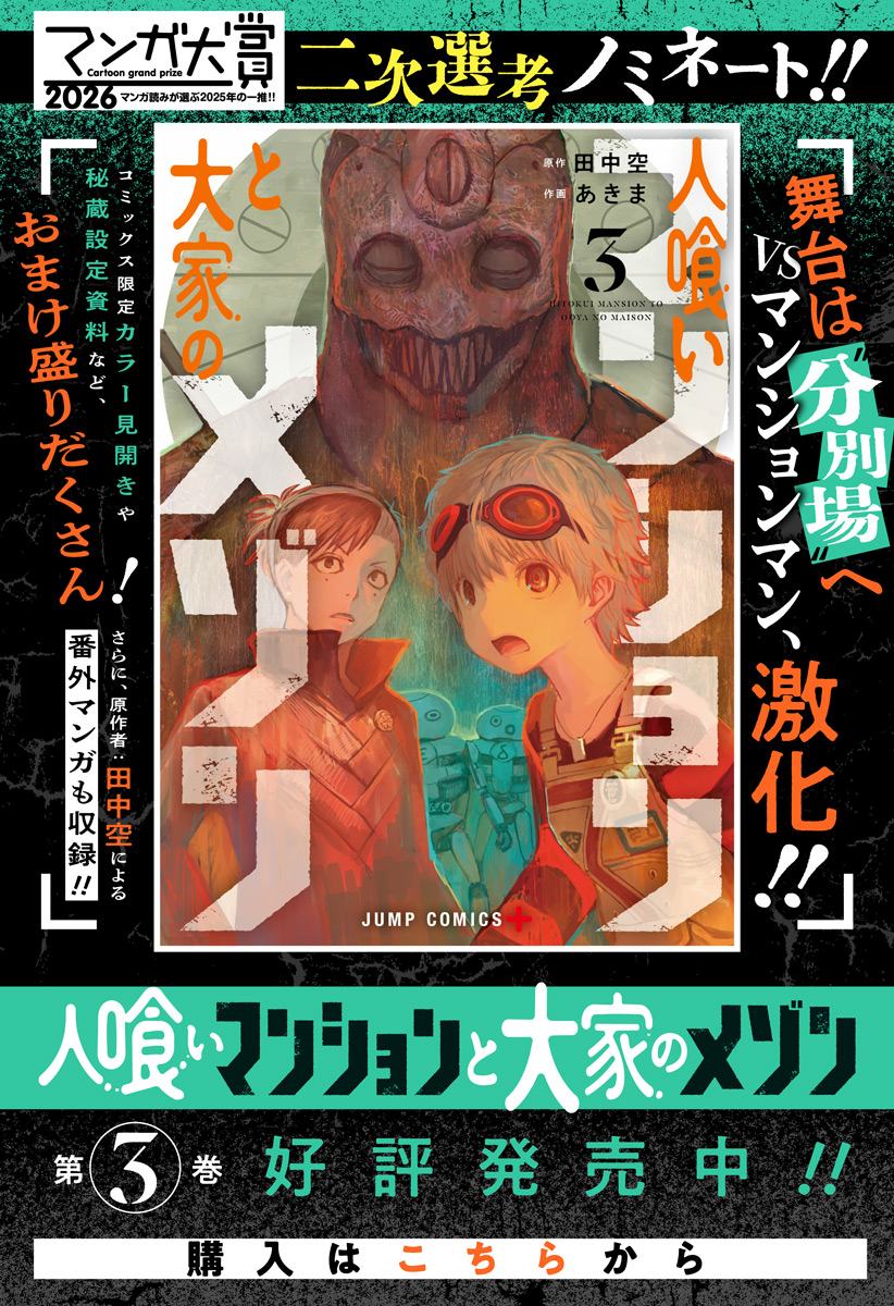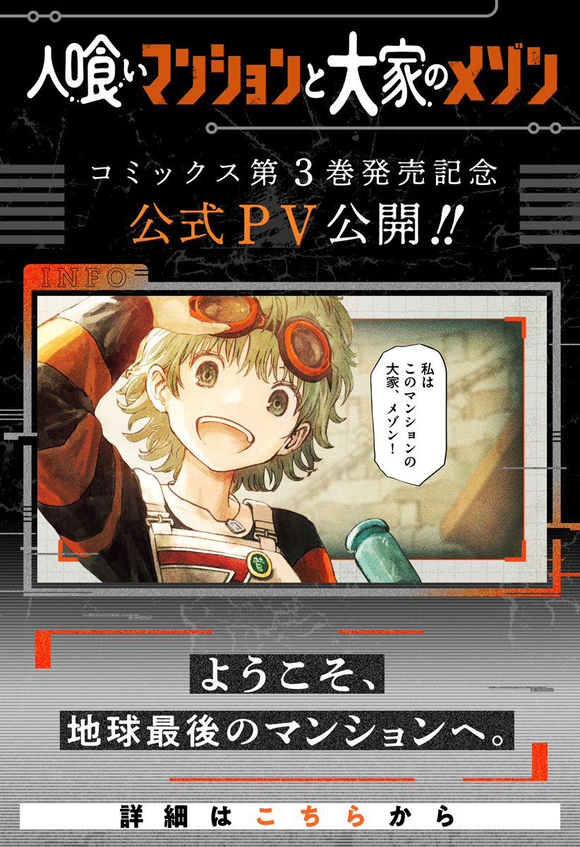<最新3巻発売記念!!1巻分無料!>※一挙公開!キャンペーン期間:2/17まで※ <隔週金曜更新!最新3話無料>地球崩壊1秒前。永遠の時間が流れる奇妙な「マンション」で、人々は滅亡を免れ生活していた。生まれた時から大家だった少女・メゾンが立ち上がる時、マンションの秘密が明かされる…!超強力タッグが紡ぐ、奇想天外SF冒険譚! [JC3巻発売中]
