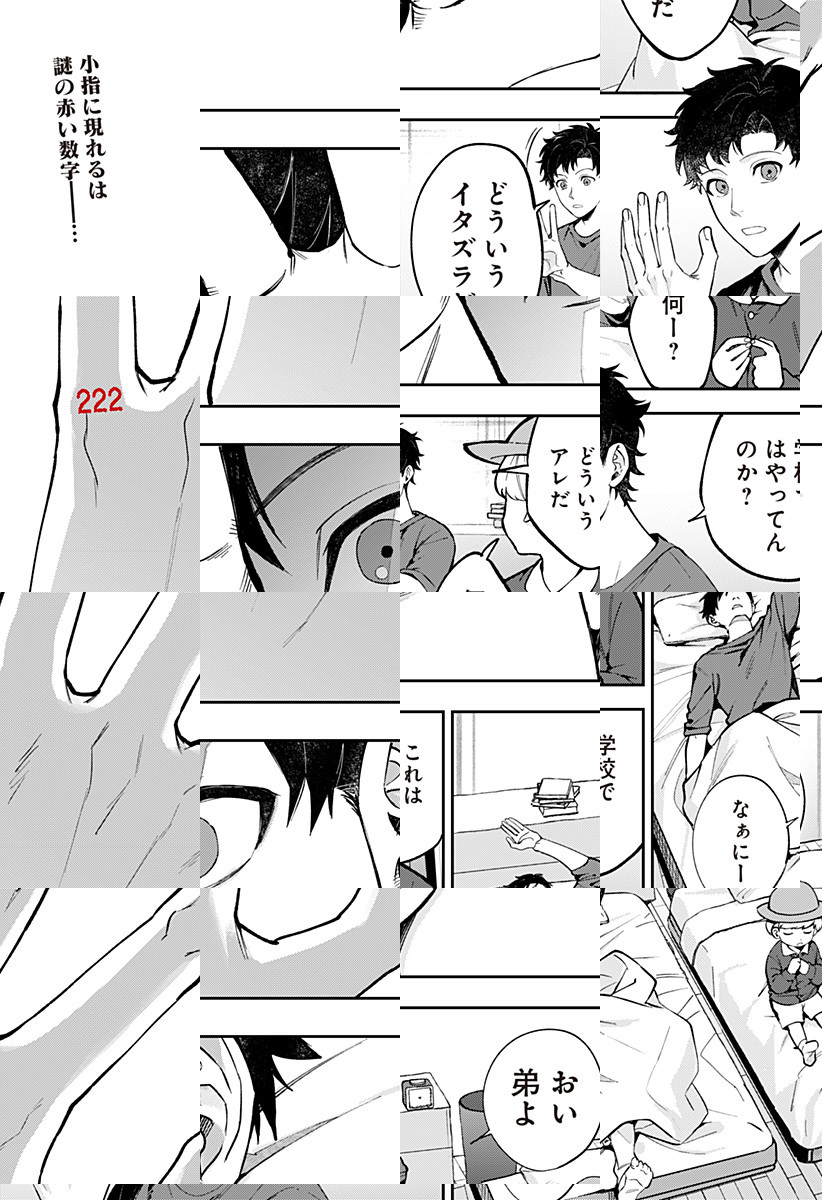 ある日急に小指に現れた「222」という赤い数字。高校生の誠は、自分以外には見えないこの数字が1日ずつ減っていくことに気づく。カウントダウンが終わる日に何が起こるのか…!?