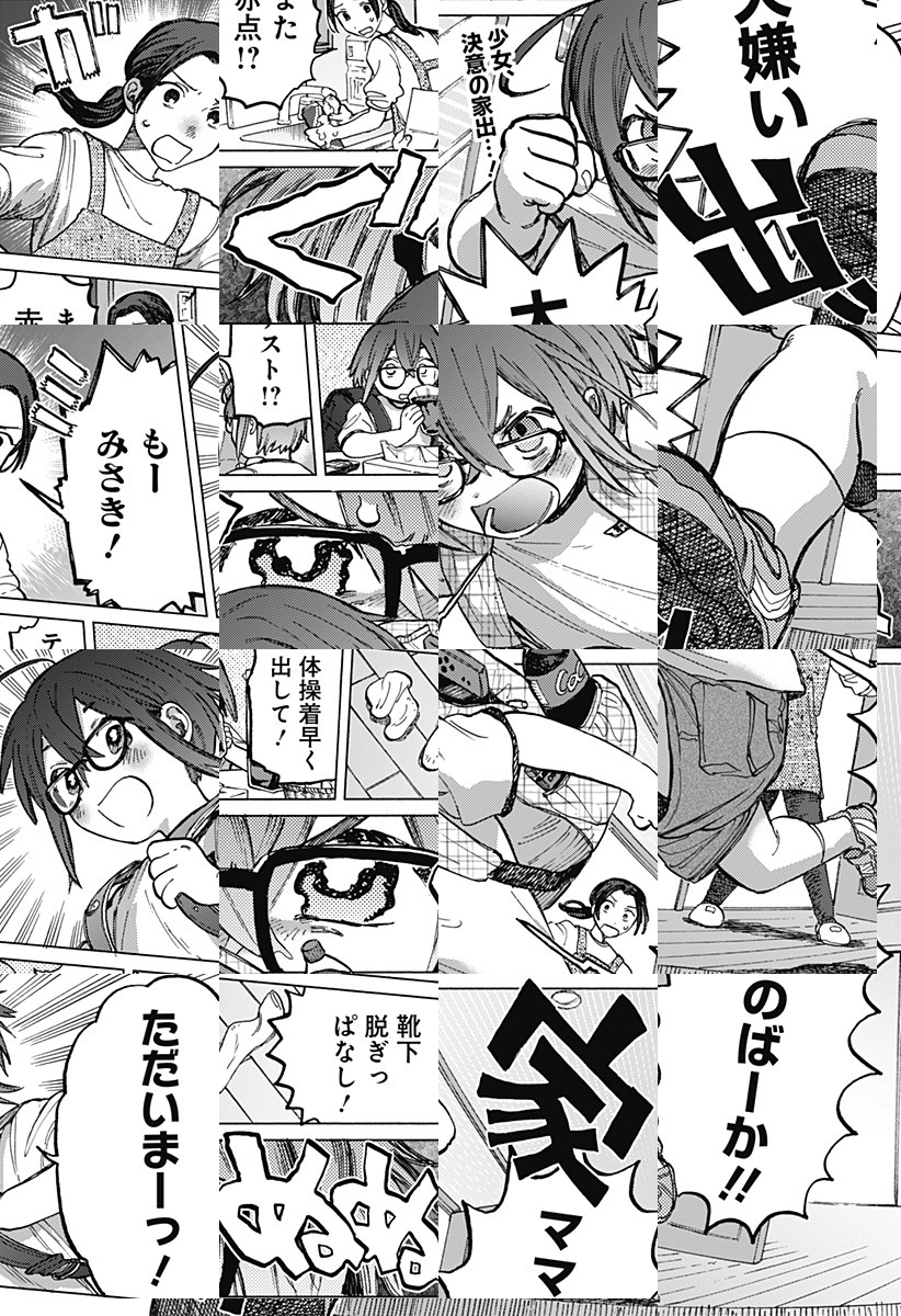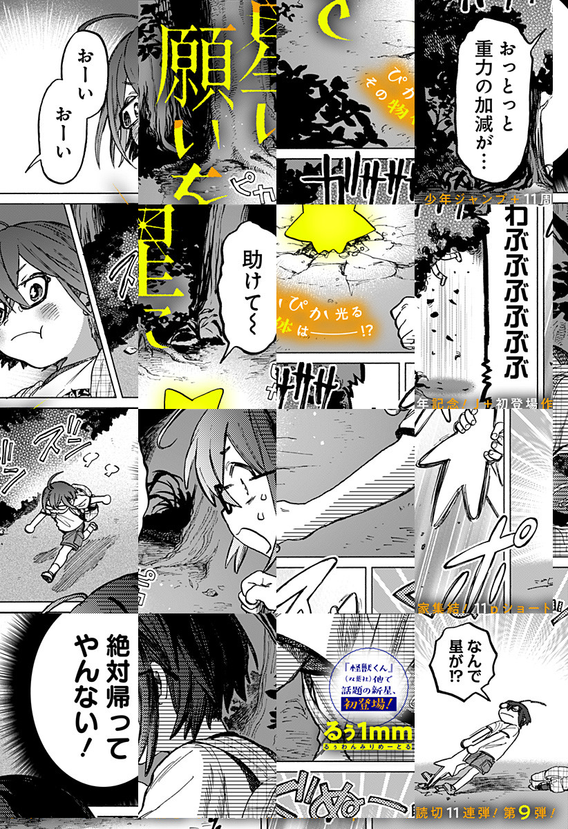 みさきはママに叱られてばかり。ママに反抗して家を飛び出すと、星型の宇宙人と出会う。その宇宙人は家出した子供を探しに地球に来たらしく…『怪獣くん』のるぅ1㎜が描く親子の物語。