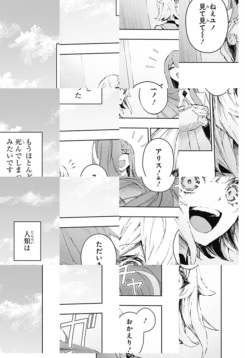 争いの末に、人類がほとんどいなくなってしまった世界。生き残ったユノとアリスは、一緒に幸せに暮らしていた。二人ぼっちでも、それはそれは幸せに…。