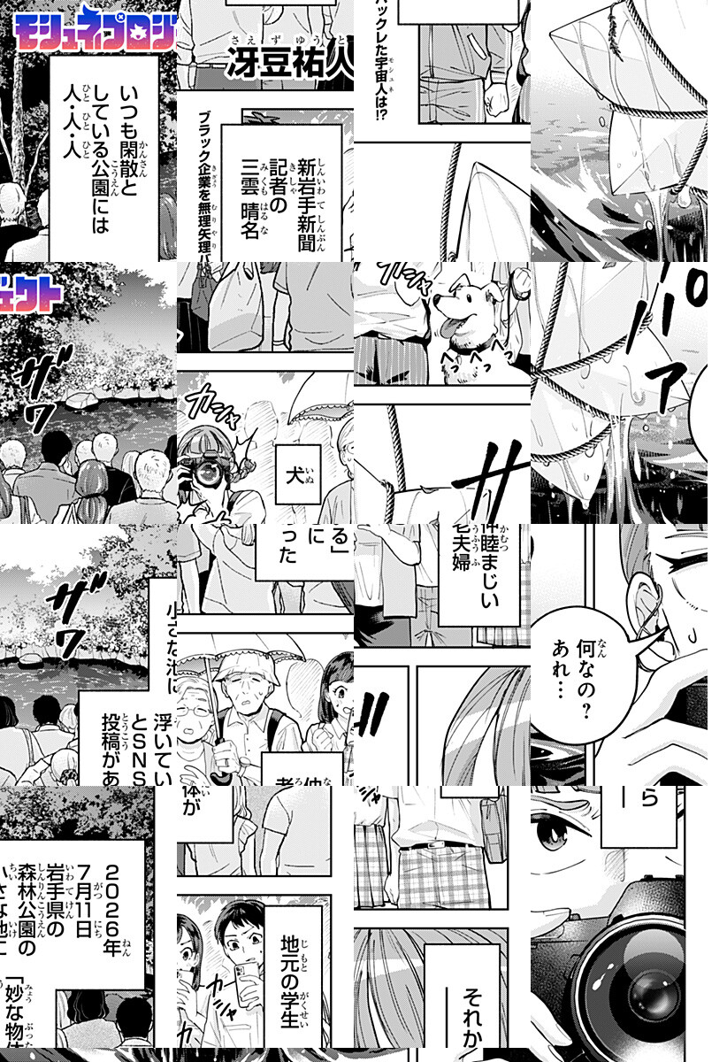 <毎週土曜更新>ジャンプ+連載オーディション2023大賞受賞作!工場で働く吉良宮雅の前に突然現れた宇宙人・モシュネ。コピー能力を持つモシュネの力が地球を揺るがす大事件に発展する!?ネオ宇宙人ストーリー開幕!