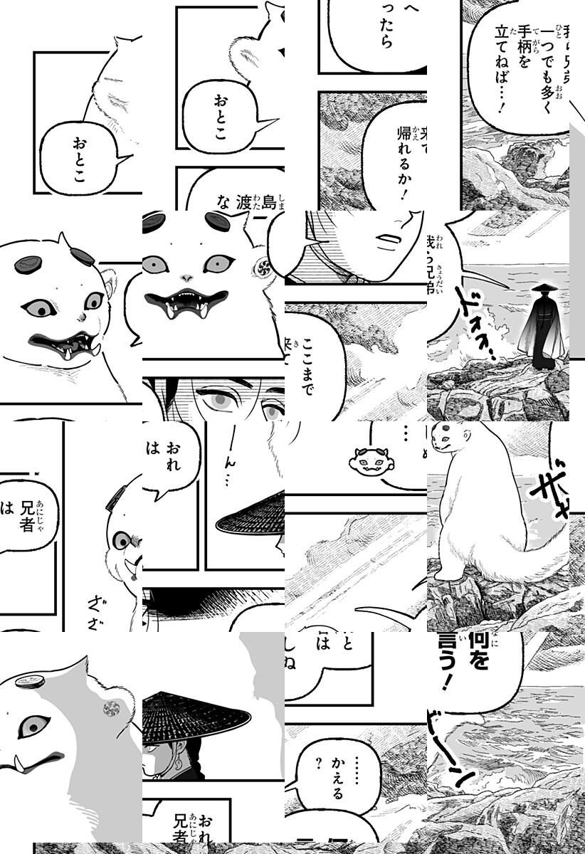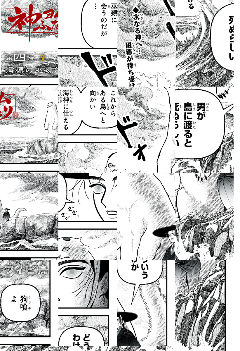 <隔週木曜更新>神を“読む”力を持つ男・巳夜刀とその弟・狗喰。一風変わった彼らの旅路は、神なる獣“荒覇吐”が人を喰っていると噂されるある村へ至る…。鬼才・フィビ鳥が圧巻の世界観で描く巨弾巡礼戦記、始動。