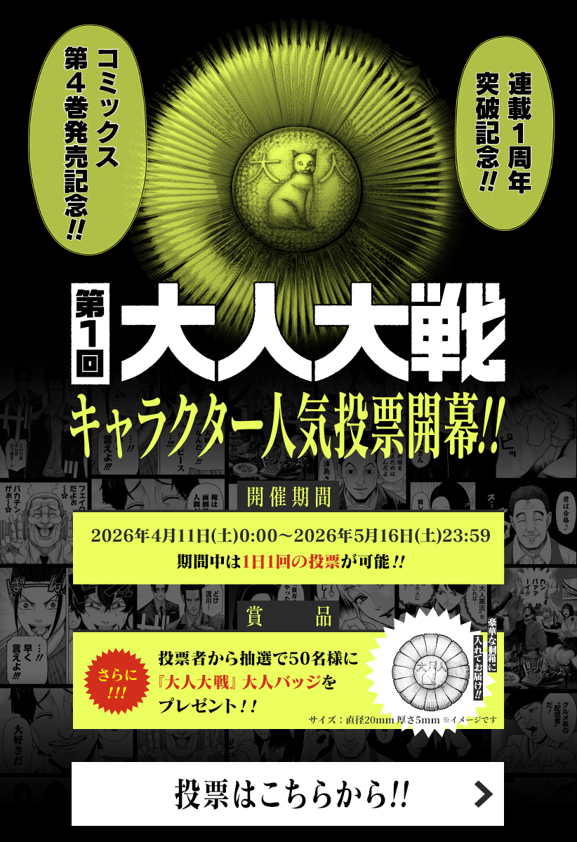 <連載1周年突破&コミックス最新4巻発売記念!!6話分無料!>※一挙公開!キャンペーン期間:4/25まで※※キャラクター人気投票は5/16まで実施中!※ <毎週土曜更新>正しい大人とは?浦島優太郎は父が残した言葉を胸に、自らに課した“大人憲法”を守りながら立派な大人を目指していた。しかし、その“大人憲法”が後に世界を大きく変えることに…。『左ききのエレン』原作者かっぴー先生新連載!評価がすべての監視社会に立ち向かうサバイバルドラマ、開幕――!! [JC4巻発売中]