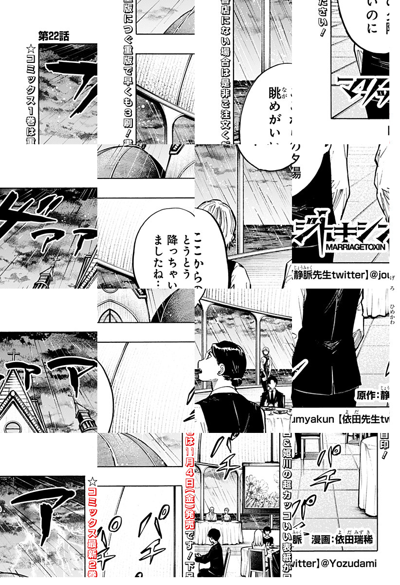 <毎週水曜更新!最新5話無料>2026年4月よりTVアニメ放送開始! 数百年続く殺し屋『毒使い』の青年・下呂。裏稼業に身を置き、女性が苦手な彼にとって結婚はするべきではないものだった。しかし、『毒使い』の血を絶えさせないため実家は彼の妹に対し、強制的に跡継ぎを産ませることを通告。そんな時、下呂は仕事のターゲットだった結婚詐欺師・城崎と出会い…!?「――そんな提案(プロポーズ)、初めて」結婚詐欺師をアドバイザーにした殺し屋の婚活が始まる!目指すは最高の結婚…世界一ハードな婚活バトルアクション!! [JC17巻4/3発売予定]