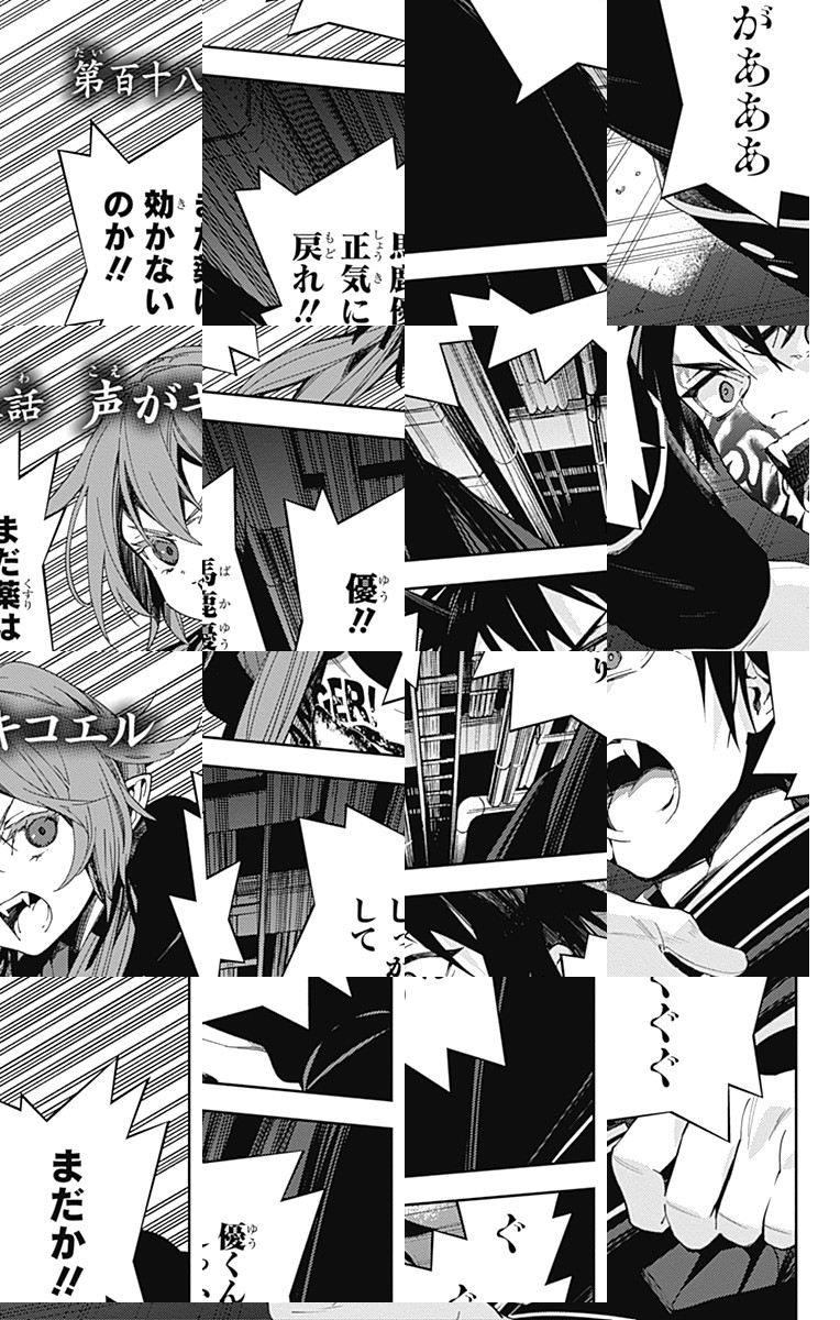 未知のウイルスにより人類は壊滅、子供だけが生き残り、地下都市で吸血鬼に支配されていた。百夜優一郎は仲間たちの犠牲のもと、ただ一人脱出に成功、復讐を誓う。