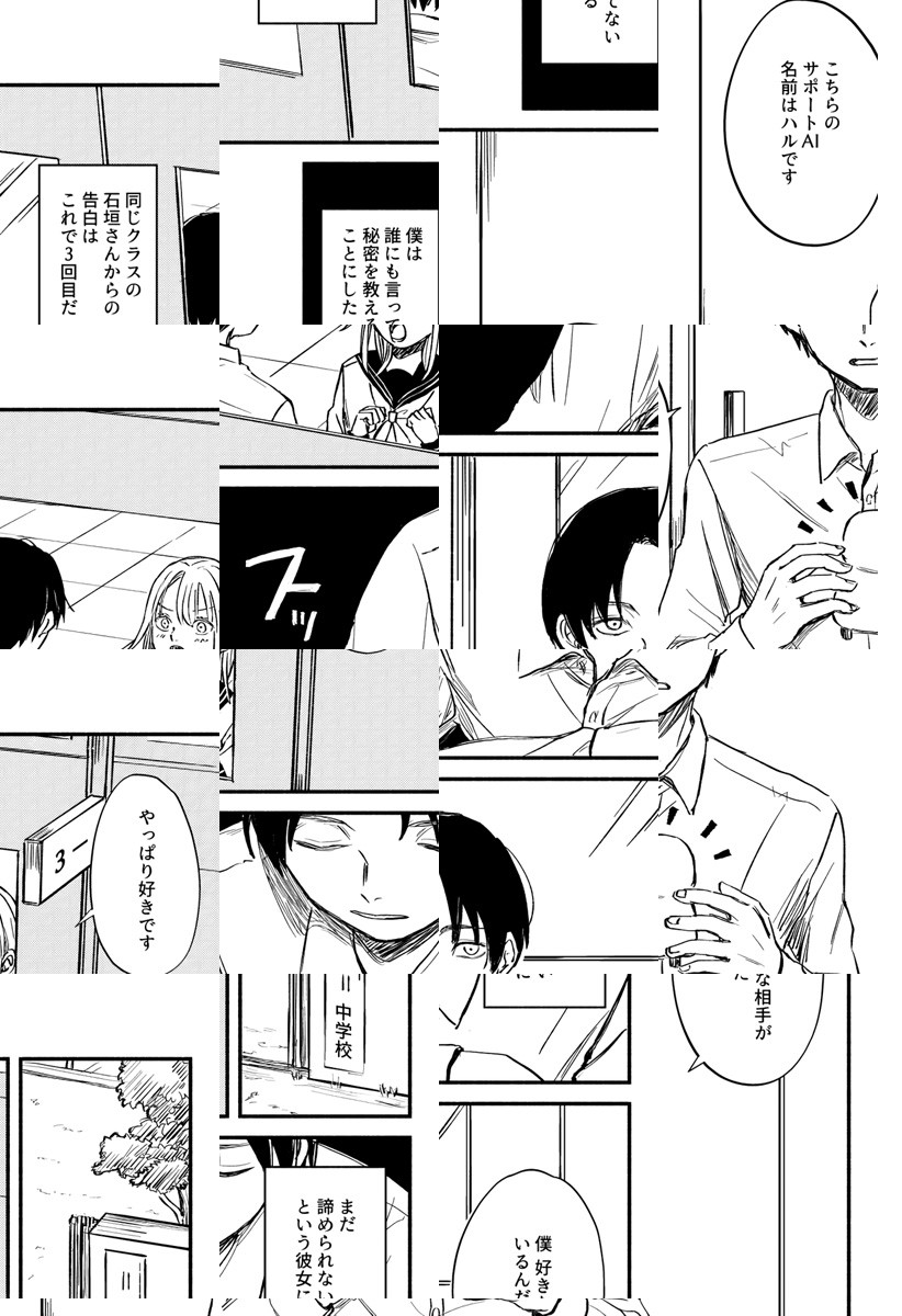 同級生に告白され、思わずいつも一緒にいるサポートAI“ハル”のことが好きだと言ってしまった主人公。しかし同級生はあきらめず、奇妙な三角関係の日常が始まり…恋愛漫画賞準大賞受賞作品!