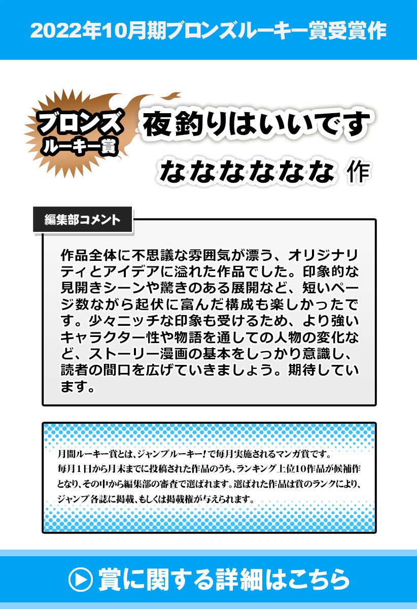 ある夜の海辺、少女は一人の男と出会う。「夜釣り」をしていると話す男の竿にかかったその生き物は、魚ではない「何か」だった――。夜が誘う、不思議な出会いとその顛末。