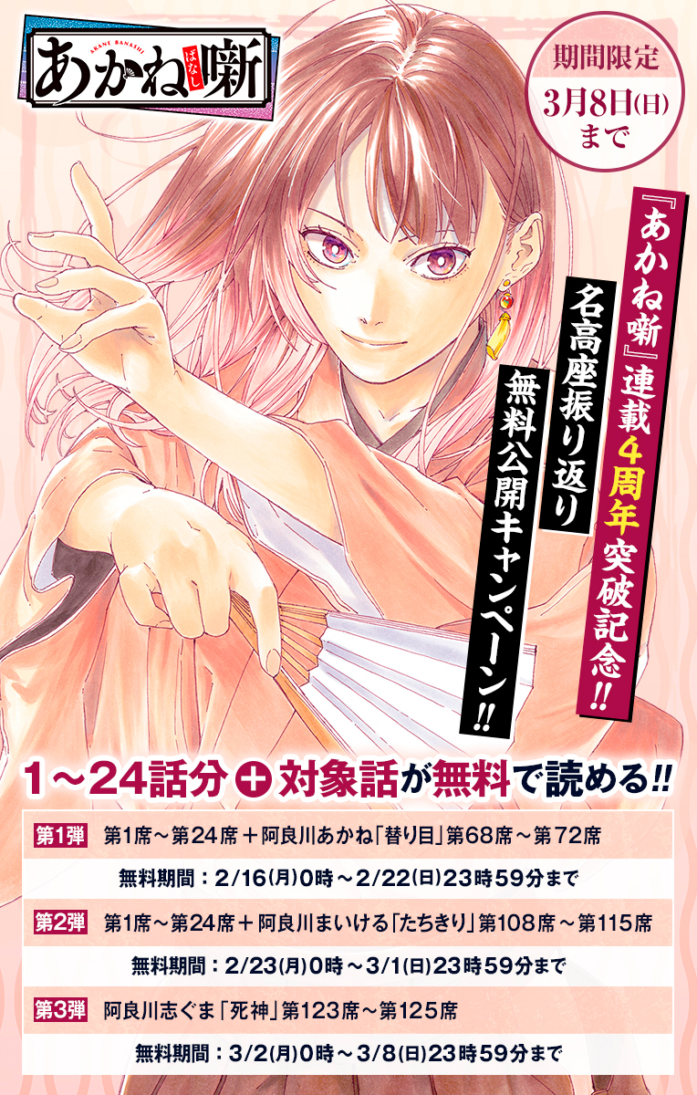 <連載4周年突破記念!! 1~24話分+名高座振り返り無料公開キャンペーン!!>※一挙公開!キャンペーン期間:3/8まで※ 幼い頃、父の魔法の様な落語に魅せられた朱音は、父のある一席を機に自身も噺家としての道を歩み始める。17歳になった朱音が目指すのは落語界の最高位「真打」になること――。一流の技量を習得するため、様々な試練が朱音を待ち受け…!? 新生落語ヒロイン、ここに誕生!!