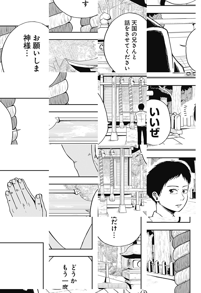 天国の兄と話しがしたいと神に祈る少年は、神と名乗る男に出会う。毎日供物を捧げれば、願いを叶えると言われるのだが……!!?