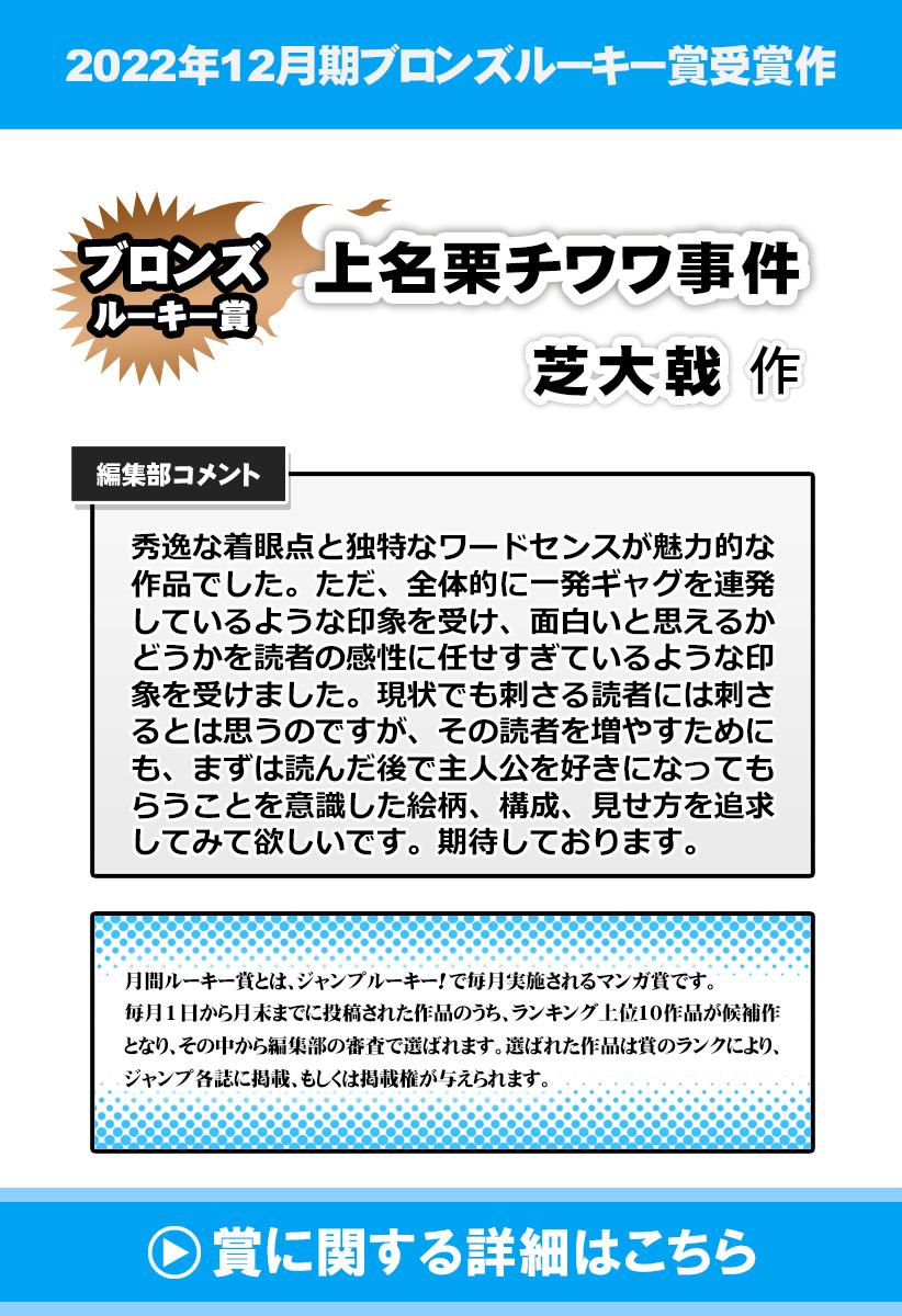 勉強中の春見に友人の秋山から、「親族が全員チワワに殺されたから葬式に参列してほしい」と衝撃的な内容の電話が届く。世界に類を見ないチワワによる大量殺人事件の真相とは!?独特な雰囲気が癖になるギャグ作品!