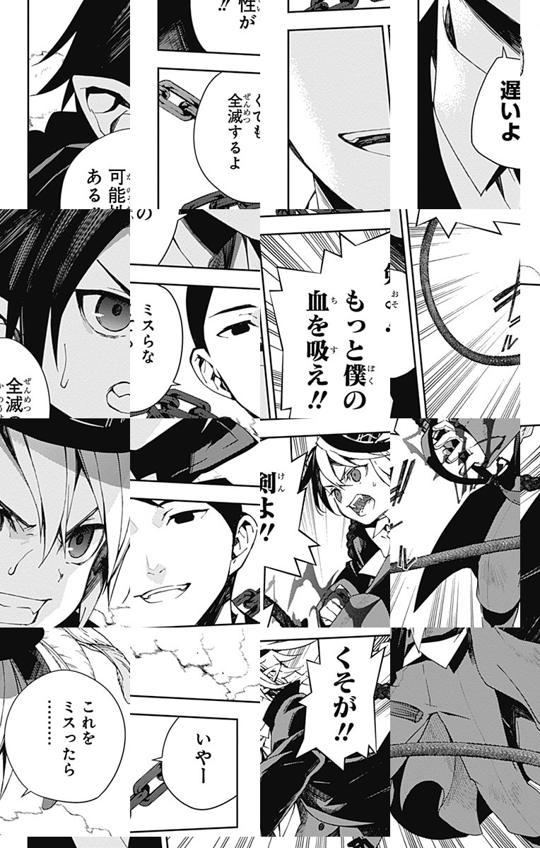 未知のウイルスにより人類は壊滅、子供だけが生き残り、地下都市で吸血鬼に支配されていた。百夜優一郎は仲間たちの犠牲のもと、ただ一人脱出に成功、復讐を誓う。