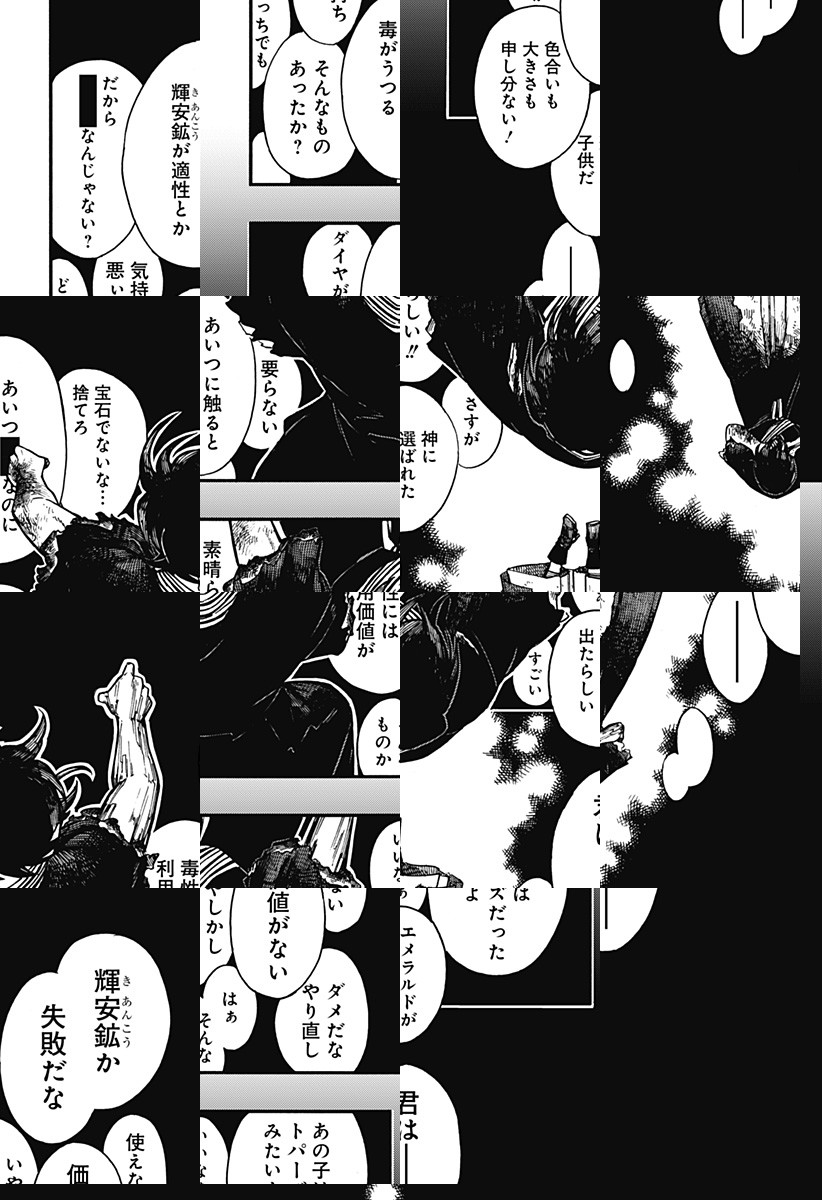 <完結済み>「石」が生活の中心にある世界。とある地下集落を訪ねた鉱石職人の朱星は、左足が石化した少年と出逢う。3本線のピアスをした男を探す彼にはある秘密が…!?磨き磨かれる師弟の、家族を救う旅が始まる! [JC全9巻発売中]