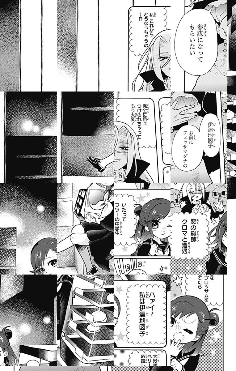 <完結済み>悪に堕ちる(アクロトリップ)。オタ活のために! 新潟県奈仁賀市に住む伊達地図子は、街を守る魔法少女(ベリーブロッサム)を愛するオタク少女。しかし、肝心の悪の総帥・クロマがヘタレでヨワ過ぎるため、もはや誰も二人の戦いを気にしていなかった。「魔法少女をもっと輝かせたい…!」その欲望(?)が、内気な中学生を、変なヤツば~っかりの悪の道へ導いてしまう…『りぼん』で大反響を巻き起こしている新感覚・悪堕ちコメディ!