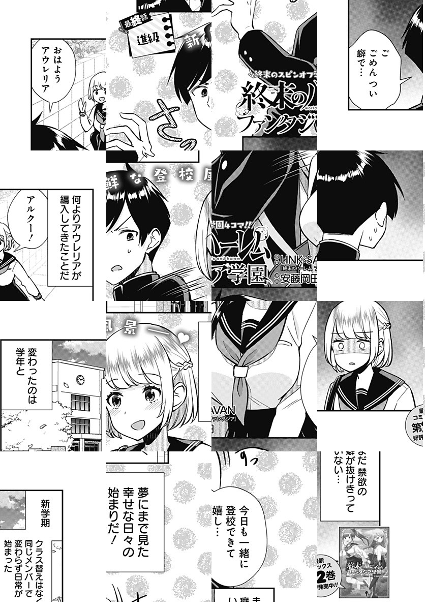 <完結済み>『終末のハーレム ファンタジア』公式スピンオフ4コマ始動!!舞台は現代。想い人のアウレリアと同じ学校に進学すべく高校受験に挑んだアルクはあえなく不合格、アウレリアと離れ離れになってしまう。しかし、入学先は女子生徒だらけの“ハーレム学園”で……!? [JC全3巻発売中]