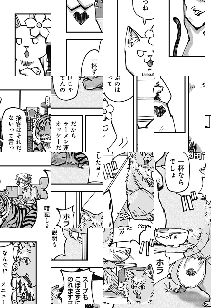 <毎週月曜更新!最新2話無料>アニメ好評配信中! 人間のいない、猫だけが営むラーメン屋に面接に来た珠子。猫の店長に猫好きか聞かれ、珠子は正直に犬派と答えるとあっさり採用される。しかし仕事内容はラーメン屋ではなく、猫のお世話係で…!? [JC13巻発売中]