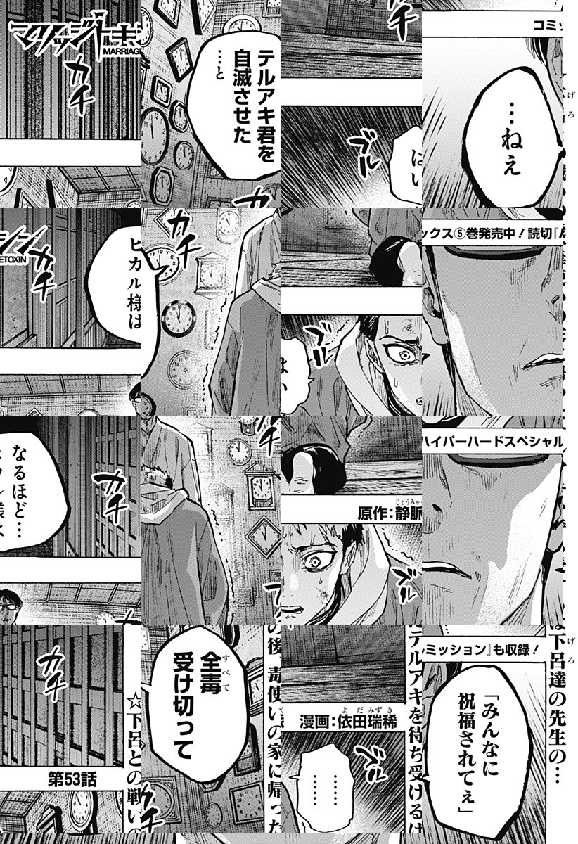 <毎週水曜更新!最新5話無料>2026年4月よりTVアニメ放送開始! 数百年続く殺し屋『毒使い』の青年・下呂。裏稼業に身を置き、女性が苦手な彼にとって結婚はするべきではないものだった。しかし、『毒使い』の血を絶えさせないため実家は彼の妹に対し、強制的に跡継ぎを産ませることを通告。そんな時、下呂は仕事のターゲットだった結婚詐欺師・城崎と出会い…!?「――そんな提案(プロポーズ)、初めて」結婚詐欺師をアドバイザーにした殺し屋の婚活が始まる!目指すは最高の結婚…世界一ハードな婚活バトルアクション!! [JC17巻4/3発売予定]