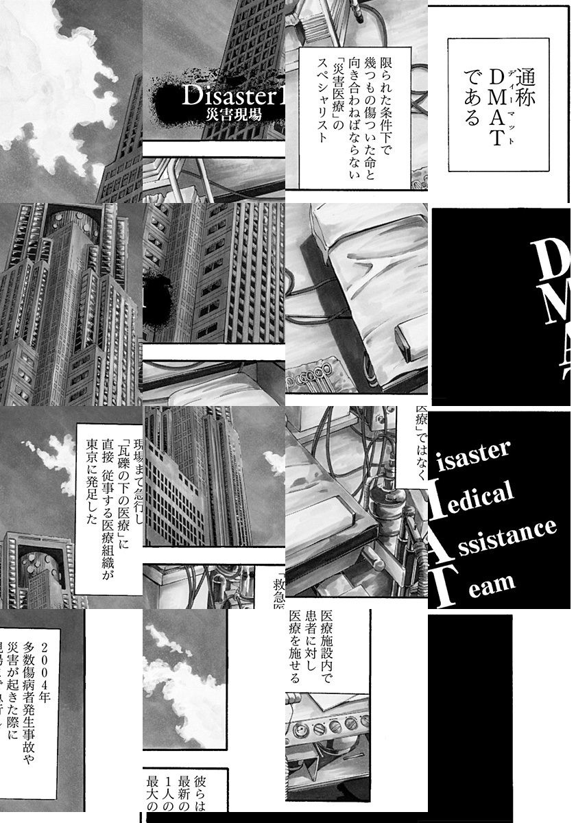 <完結済み>災害現場に届け、医の光――!! 限られた条件下で医療を施す「災害医療」のスペシャリスト、通称“DMAT”。血の苦手な内科医・八雲響は、都内有栖川総合病院の院長の強引な命令で隊員となり、壮絶な現場へと出場するが――!? 行き交う、生と死――。絶望に満ちた災害現場で今、真実のドラマが幕を開ける!! “命”を問う、災害医療コミック!!