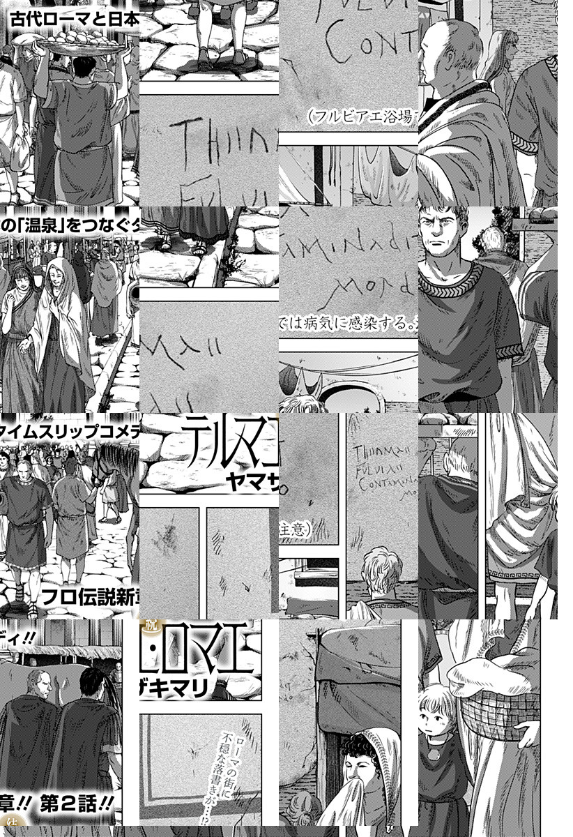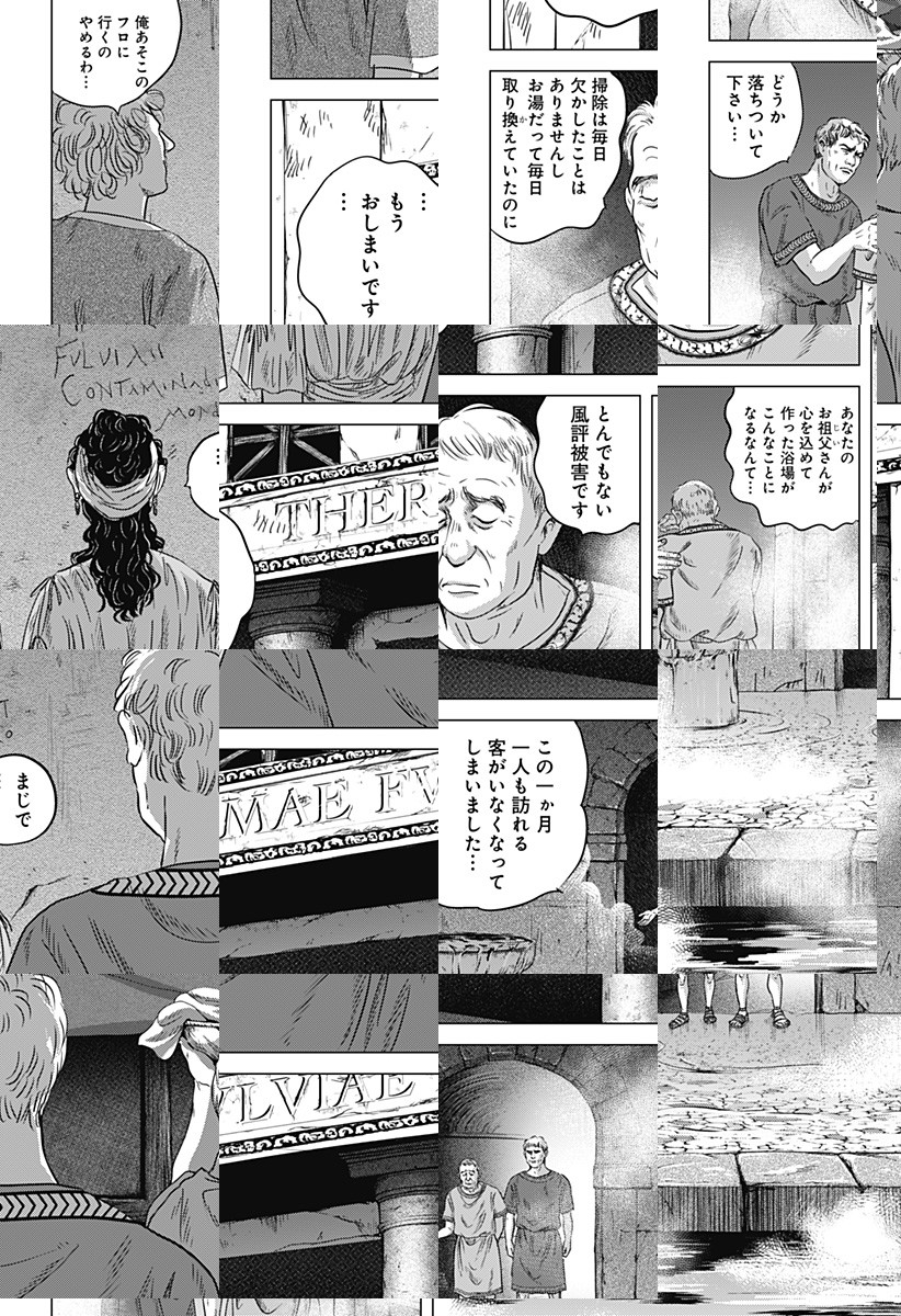 <月一火曜更新>紀元158年、ローマ帝国はアントニヌス・ピウスの統治下20年目。ローマの浴場設計士ルシウスは還暦を迎えて腰痛持ち、妻のさつきは謎の失踪、息子マリウスは理解不能…。さらに彼を悩ませるのはローマの風呂の仕事であったが!? [JC2巻発売中]