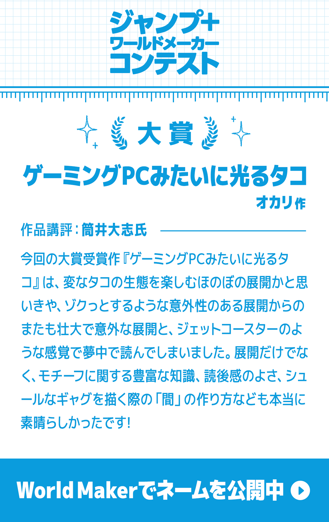 ゲーミングPCみたいに光るタコ/ジャンプ+ワールドメーカーコンテスト 筒井大志/オカリ シェアする