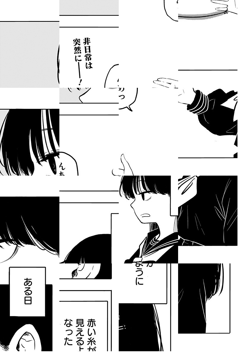 ある日突然、小指に巻き付いた赤い糸が見えるようになったこより。学校をサボって糸を辿る中で、一人旅をする紅子と出会う。糸の行き着く先で2人が見たものとは――?