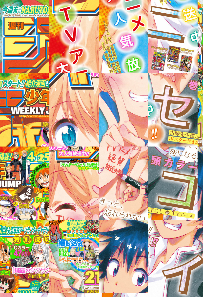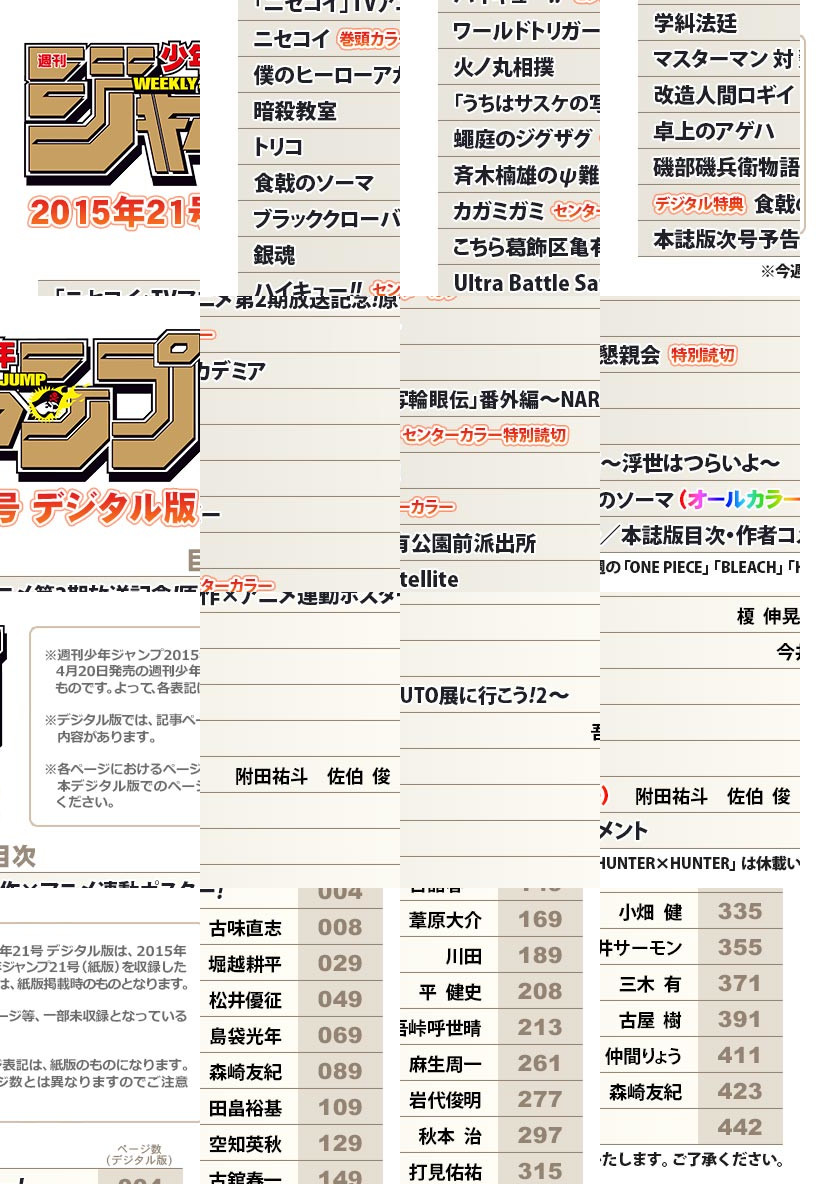 巻頭カラーは、TVアニメ大人気放送中!!『ニセコイ』古味先生描き下ろし&TVアニメポスター付き!!/VS白鳥沢編激闘Cカラー!!『ハイキュー!!』/呪術アクション特別読切Cカラー47P!!『蠅庭のジグザグ』/早くも大人気御礼Cカラー!!『カガミガミ』/【電子版限定特典】『食戟のソーマ』のフルカラー版! ※記事ページ・綴じ込み付録の収録はありません。