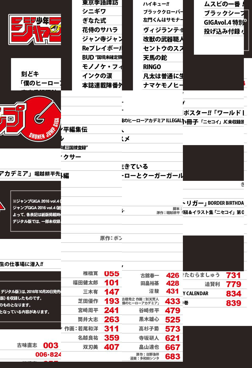 ※「ジャンプGIGA」デジタル版には、紙版の付録は付属しません。ご了承ください。 ●話題沸騰の少年ジャンプ新増刊「ジャンプGIGA」vol.4のデジタル版が紙版と同日に発売! ●巻頭カラーは『ニセコイ』完結後、初の読切! 古味直志『刻どキ』!! ●『ニセコイ』の未収録原稿&描き下ろしを含む多数のイラストをまとめた『ニセコイ』第0巻を収録!! ●センターカラーは『マジカルパティシエ小咲ちゃん!!』作者の最新作! 筒井大志『Reプレイボール』!! ●非合法ヒーローを描くスピンオフ、大反響!! 古橋秀之×別天荒人×堀越耕平『ヴィジランテ-僕のヒーローアカデミア ILLEGALS-』!! ●本誌連載番外編は3作品を掲載!! 『ハイキュー!!』&『ブラッククローバー』&『左門くんはサモナー』!! ●椎橋 寛『東京季語譚訪』をはじめ、超強力連載陣の作品がついに完結!! ●さらに期待の新人読切陣も多数集結!! 4か月連続刊行の「ジャンプGIGA」、vol.4も最大級のドキドキをキミに!!