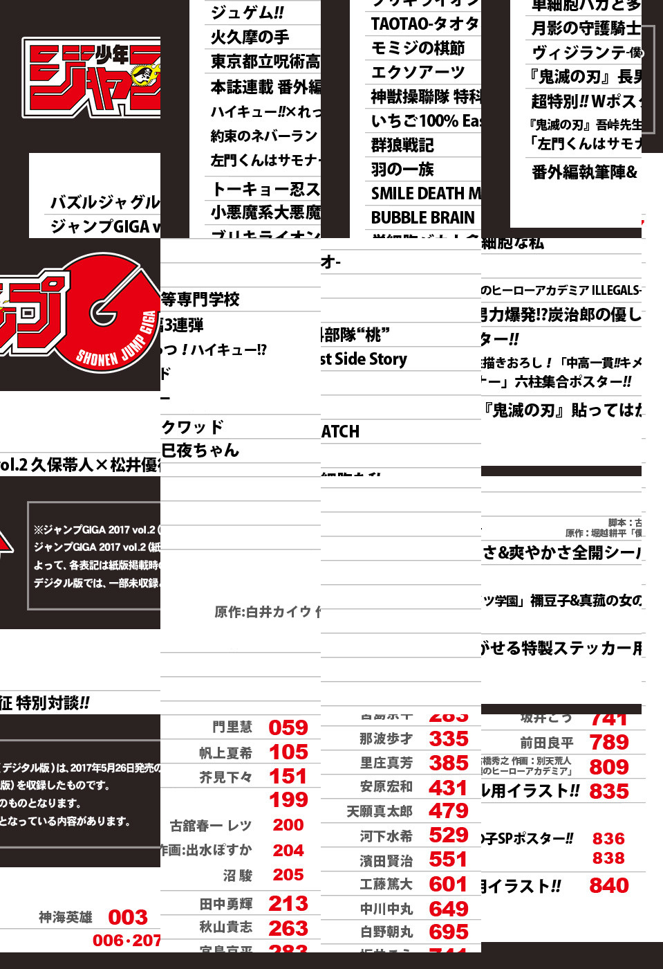 ※「ジャンプGIGA」デジタル版には、紙版の付録は付属しません。ご了承ください。 ●キミの退屈を滅する、週刊少年ジャンプ特別編集増刊「ジャンプGIGA」! vol.2のデジタル版が紙版と同日に発売! ●巻頭カラーは奇才の描く最新作! 伝説のジャグラーに憧れた少年が…!? 神海英雄『バズルジャグル』!! ●2話目もセンターカラーでドキドキ100%! いちごパンツのおねえさんが秘める想いは? 河下水希『いちご100% East Side Story』!! ●センターカラー新連載! 不思議な“桃”を食べた武闘家たちの激闘録! 那波歩才『TAOTAO—タオタオ—』!! ●「ジャンプ+」でも好評の古橋秀之×別天荒人×堀越耕平『ヴィジランテ-僕のヒーローアカデミア ILLEGALS-』出張連載をはじめ、新進気鋭作家たちによる連載陣も見逃せない! ●本誌連載陣番外編では、本家とスピンオフがまさかのコラボ! 『ハイキュー!!×れっつ!ハイキュー!?』!! 他にも『左門くんはサモナー』&『約束のネバーランド』と、超強力な三本立て!! ●ジャンプGIGA創作術対談は、久保帯人×松井優征! 2大作家が大激論!! ●さらに期待のルーキー読切・7作品も収録!! 「ジャンプGIGA」2017 vol.2も、極厚でドキドキをお届け!!