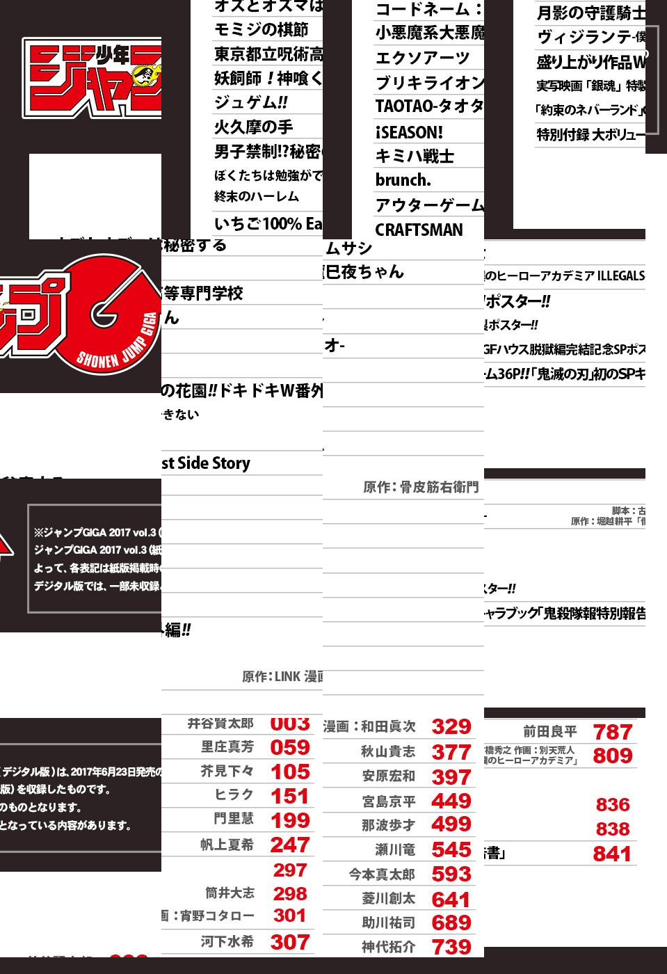 ※「ジャンプGIGA」デジタル版には、紙版の付録は付属しません。ご了承ください。 ●次代を切り開く、週刊少年ジャンプ特別編集増刊「ジャンプGIGA」! vol.3のデジタル版が紙版と同日に発売! ●表紙&特別付録は『鬼滅の刃』! 初のSPキャラブック『鬼殺隊報特別報告書』を大ボリューム36Pで収録!! ●巻頭カラーは『たくあんとバツの日常閻魔帳』作者による衝撃の最新読切! 井谷賢太郎『オズとオズマは秘密(スパイ)する』 ●伝説のラブコメ続編、第3話! あれから数年…彼女たちは!? 河下水希『いちご100% East Side Story』!! ●2大盛り上がり作品をポスターに! 実写映画記念『銀魂』&脱獄編完結記念『約束のネバーランド』!! ●番外編は、筒井大志『ぼくたちは勉強ができない』&LINK×宵野コタロー『終末のハーレム』! ドキドキの秘密の花園、2作を収録!! ●連載作品もいよいよ佳境へ! センターカラーの門里慧『ジュゲム!!』&宮島京平『ブリキライオン』を始め、新鋭作家たちによる連載作品も多数収録! ●「ジャンプ+」と衝撃の同時連載! 古橋秀之×別天荒人×堀越耕平『ヴィジランテ-僕のヒーローアカデミア ILLEGALS-』出張連載も見逃せない! ●さらに次代を担う新人読切・7作品も収録!! 「ジャンプGIGA」2017 vol.3も、圧倒的なボリュームでワクワクをお届け!!