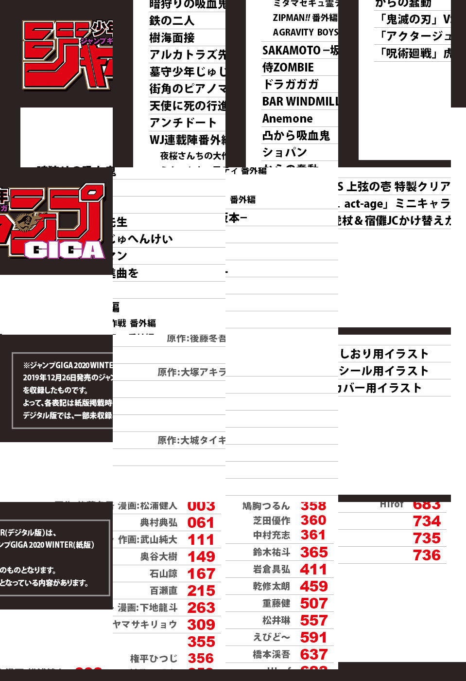 ※「ジャンプGIGA」デジタル版には、紙版の付録は付属しません。ご了承ください。 ●週刊少年ジャンプ特別編集増刊「ジャンプGIGA 2020 WINTER」、紙版と同時にデジタル版も配信! ●表紙は描き下ろしの『呪術廻戦』(芥見下々)! さらに虎杖&宿儺JCかけ替えカバー用イラストも収録! ●今号のGIGAは付録尽くし! 『鬼滅の刃』(吾峠呼世晴)のVS上弦の壱 特製クリアしおり用イラスト、『アクタージュ act-age』(原作:マツキタツヤ 漫画:宇佐崎しろ)のミニキャラシール用イラストを収録! ●巻頭カラーには、『トーキョー忍スクワッド』の実力派作画家が、2018年金未来杯獲得の際のコンビでカムバック! 悪夢を見る親友のために、少女は吸血鬼が営む“霊怪探偵”を頼り…!? 『暗狩りの吸血鬼』(原作:後藤冬吾 漫画:松浦健人) ●WJ連載陣の番外編が4本登場! 『夜桜さんちの大作戦』(権平ひつじ)&『ミタマセキュ霊ティ』(鳩胸つるん)&『ZIPMAN!!』(芝田優作)&『AGRAVITY BOYS』(中村充志) ●センターカラーに、『歪のアマルガム』作者の新作読切! その腕に抱えるものは…!? 新感覚中華バトル! 『墓守少年じゅじゅへんけい』(石山諒) ●センターカラー『ドラガガガ』(乾修太朗)など、明日を担う新鋭たちの読切は全14本を収録! ●全部合わせて20本の新作読切、700ページ超え! ボリューム満点の特級「GIGA」をご覧あれ!