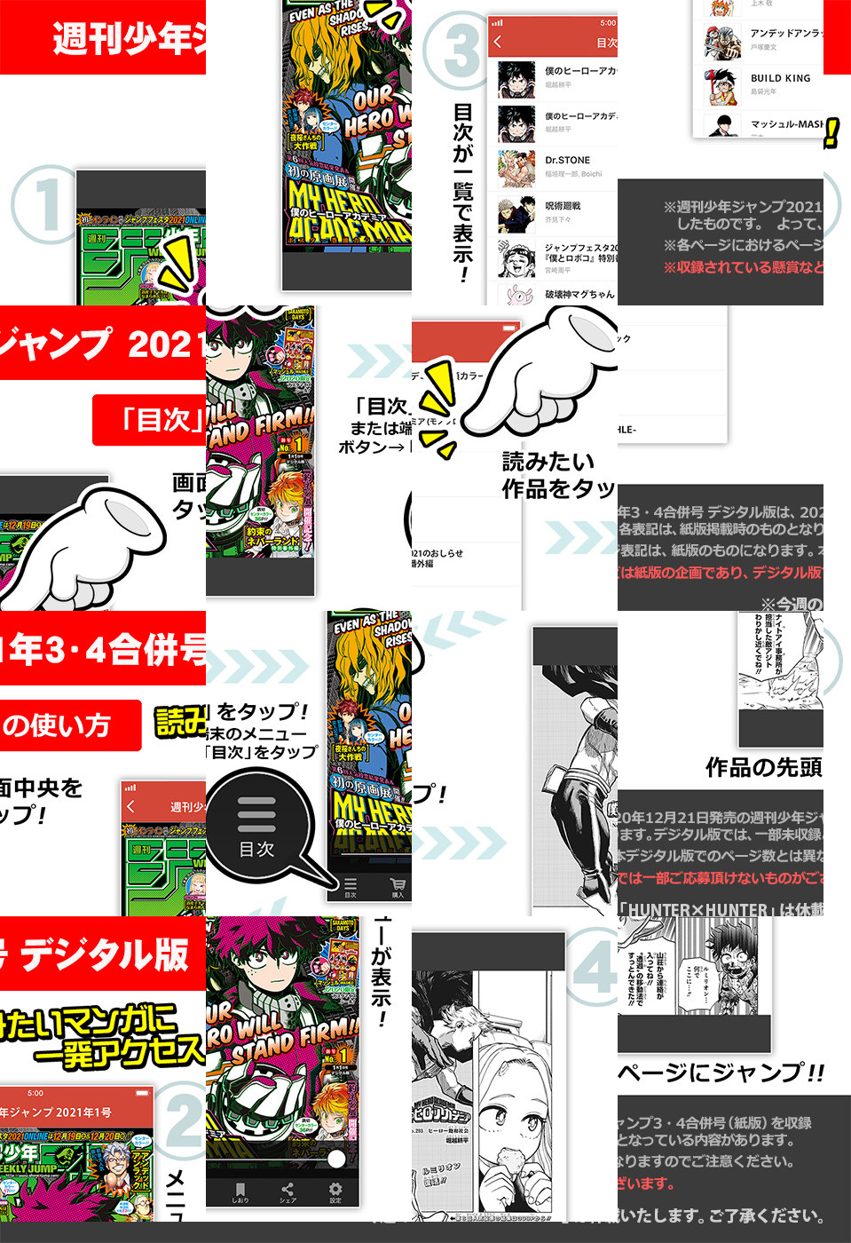 【記事ページ】も毎号収録!/巻頭カラーは、連載1000話目前!つながる表紙&ジャンプ史上最大ポスター!!『ONE PIECE』/「できない」ぼくたちの物語の結末は——!恋と勉強の教育指導的ラブコメ、クライマックス特大センターカラー!!『ぼくたちは勉強ができない』/宇佐崎しろ×期待の新鋭!!異端の弁護士サスペンス読切センターカラー47ページ!!『炎眼のサイクロプス』/元気を届けに帰ってきたぞ!描きおろし年末特別読切センターカラー14ページ!!『こちら葛飾区亀有公園前派出所』/1〜3巻重版御礼&神覚者候補選抜試験、開始直前センターカラー!!『マッシュル−MASHLE−』/※デジタル版では、綴じ込み付録・シリアルコードなど一部未収録となっている内容があります。※収録されている懸賞などは紙版の企画であり、デジタル版では一部ご応募頂けないものがございます。